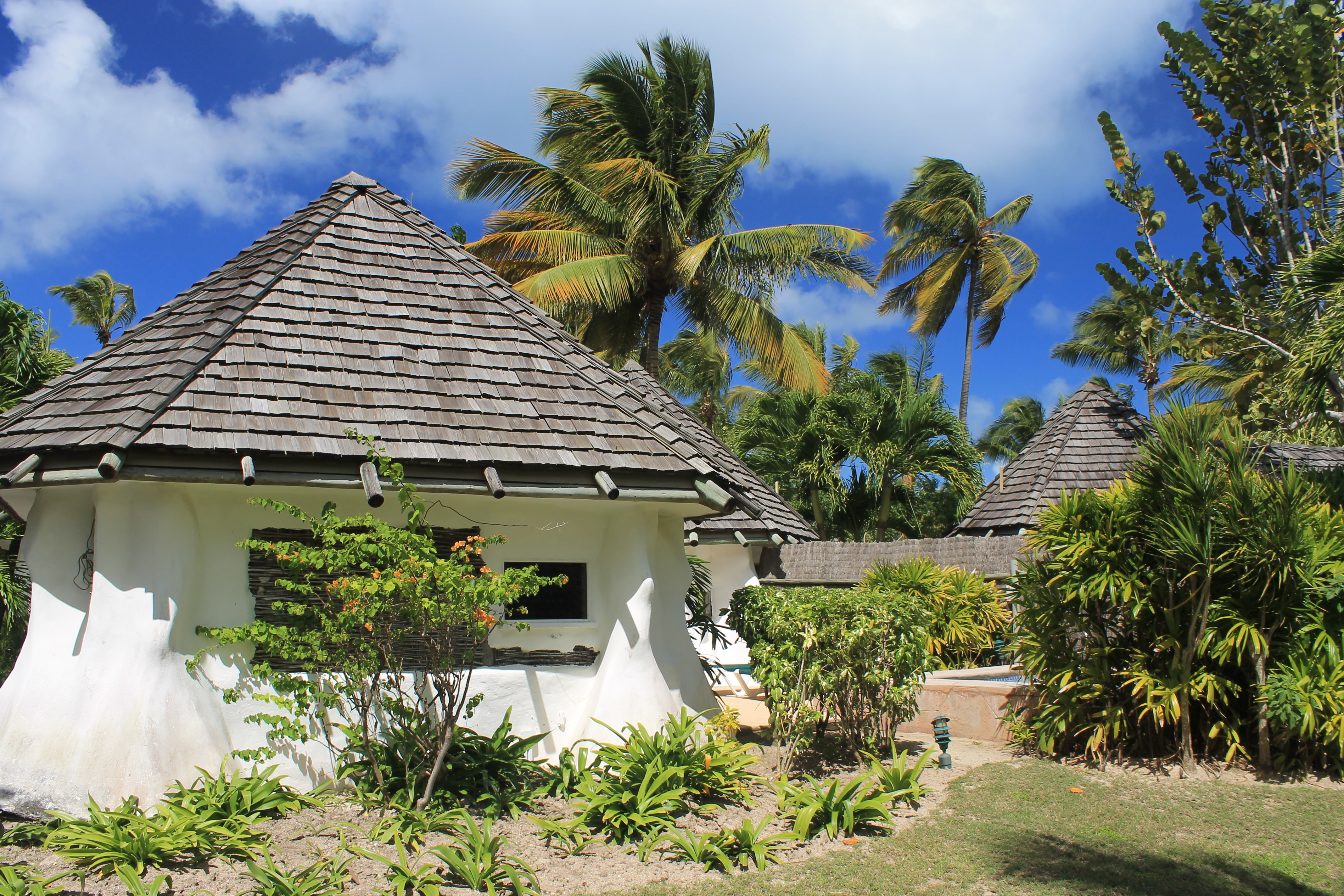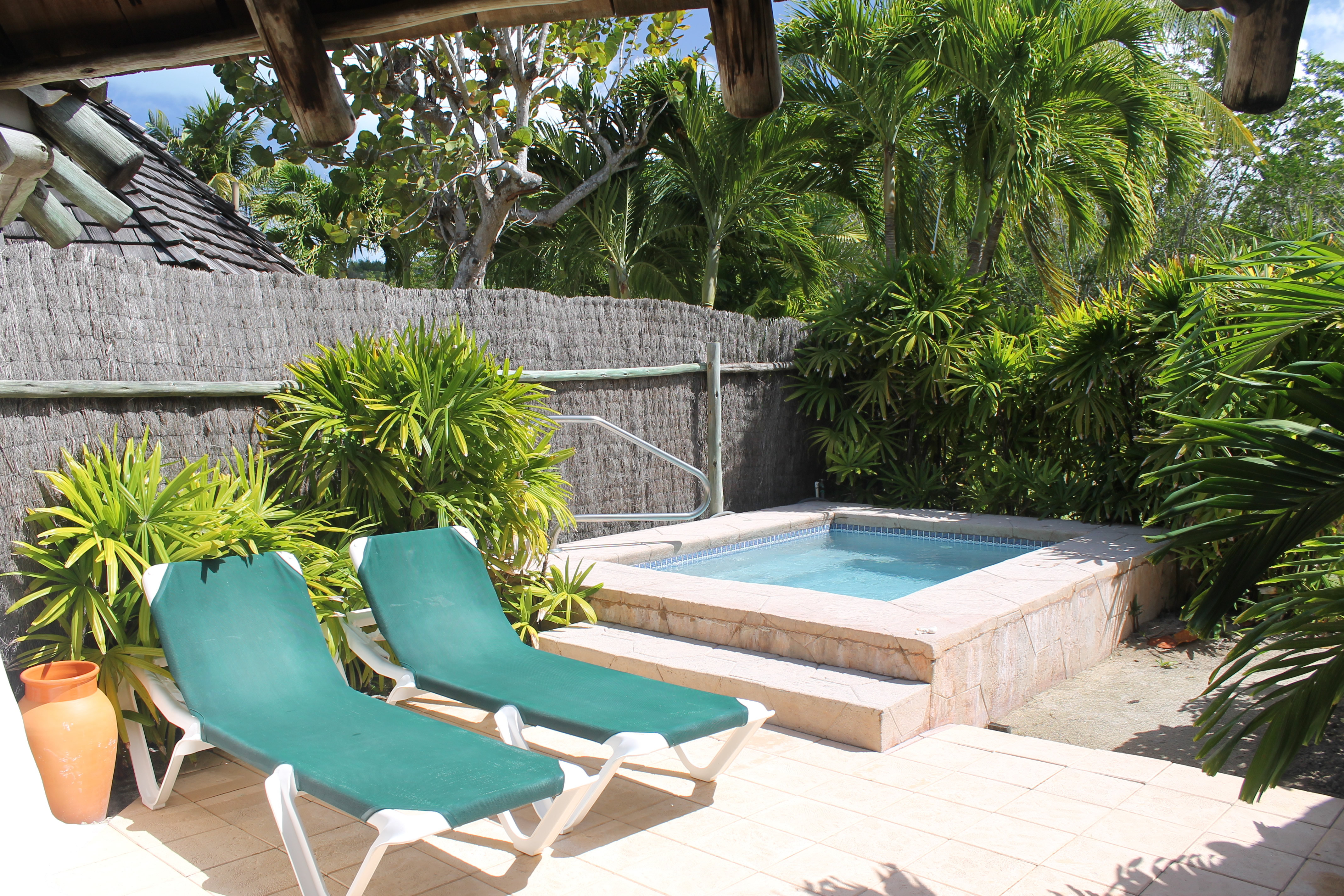 There was also a sunny section of the patio for working on your (all over) tan and beyond that a private plunge pool. The whole area behind the huts was surrounded by thatch fence or tall shrubs except for a three foot gap that led to a common grassy area and then to the shore of the lagoon. None of the guests were ever back there although one time there were some landscape workers trimming the trees and bushes. Still Sandy was a little nervous. She kept asking me what to do if someone happened to pass by and look in the back. I told her to smile and wave.