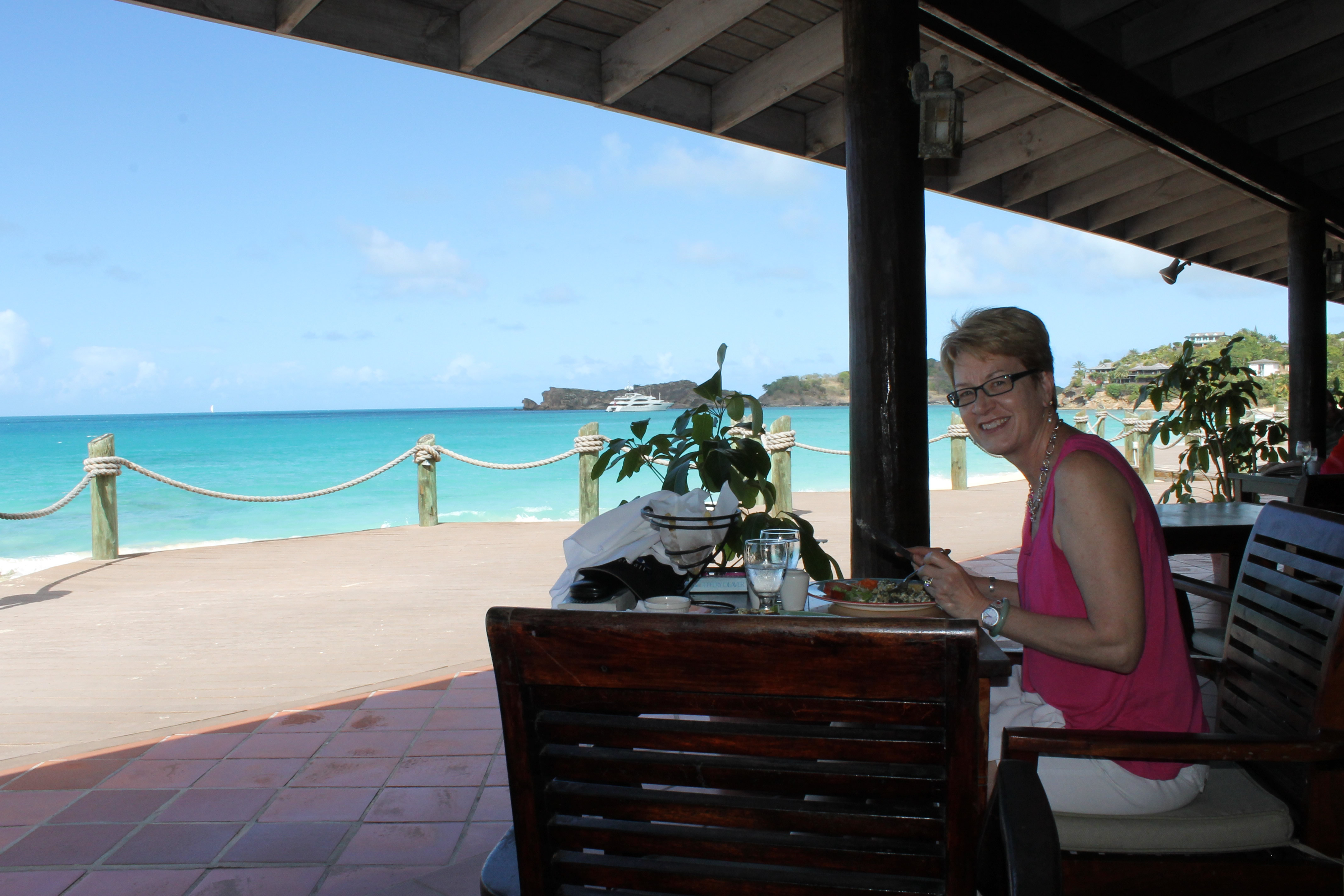 Not only was the food free (so to speak) but it was pretty good. There were a number of different places to eat at the resort. The main restaurant, the Sea Grape, was in the middle of the resort right along the beach and close to our hut. The view of the water was nice and they had plenty of space. We ate almost all of our meals there. Breakfast was buffet style with lots of tropical fruits to choose from as well cereal, toast and cooked breakfast. For lunch we cold order from a menu that featured a lot of good sandwiches. Dinner was also from a menu that changed every night but we always found something that we liked. The fact that we had plenty of good wine to go with it probably helped. The service was good too - there was no problem getting your wine glass filled. That actually surprised me. I figured that the combination of all-you-can-eat-and-drink with island time would mean that you could never get the attention of the wait staff. But our order was usually taken quickly, the food came in a reasonable amount of time, and refills on soft drinks and wine were easy to get. Usually there was one person that was walking from table to table with a bottle of white wine and a bottle of red wine looking for people who needed refills. Paradise indeed!