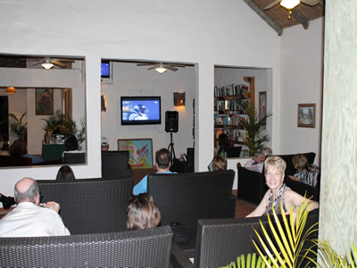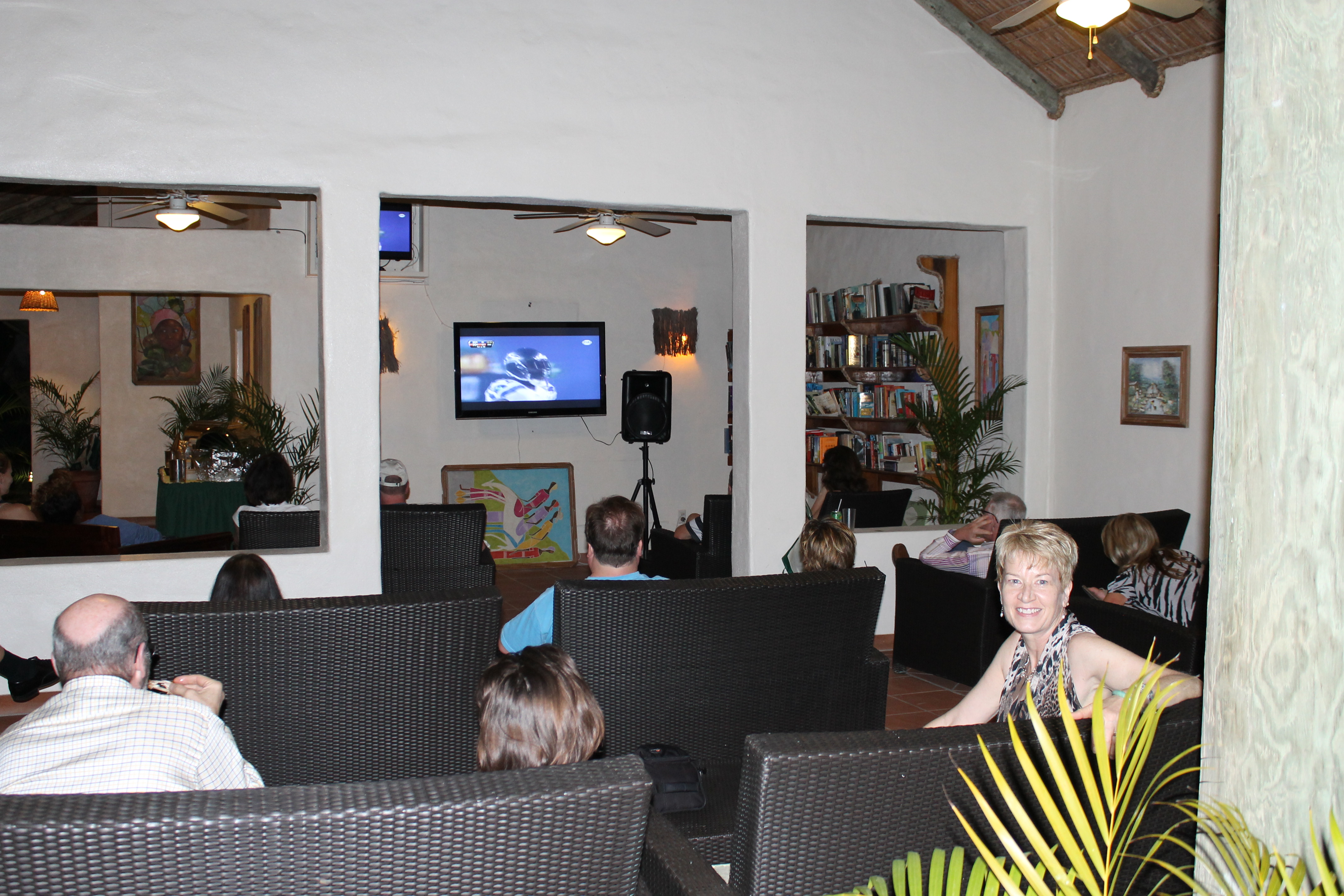Actually it's not really true that the night that we ate at Gauguin's we didn't have anywhere to go because it was Super Bowl Sunday. The resort had a special party arranged in the open-air library with a large screen tv and lots of drinks and snacks (we just had dinner!). We got there at half time and were surprised to see that it was already a blow out for Seattle. Sandy didn't mind at all. Being a Badger she was rooting for the Seahawks and Russell Wilson. I didn't mind seeing Seattle win either since they had never won a Super Bowl before. It was quite a mixed crowd with Seahawks fans, Bronco fans, people who didn't care, and quite a few Europeans and Australians who were just trying to figure out what the hell was going on. We were sitting next to the Bulgarians who seemed to be totally confused as to what was happening.