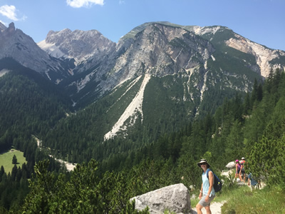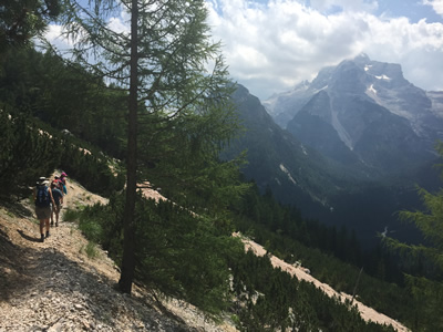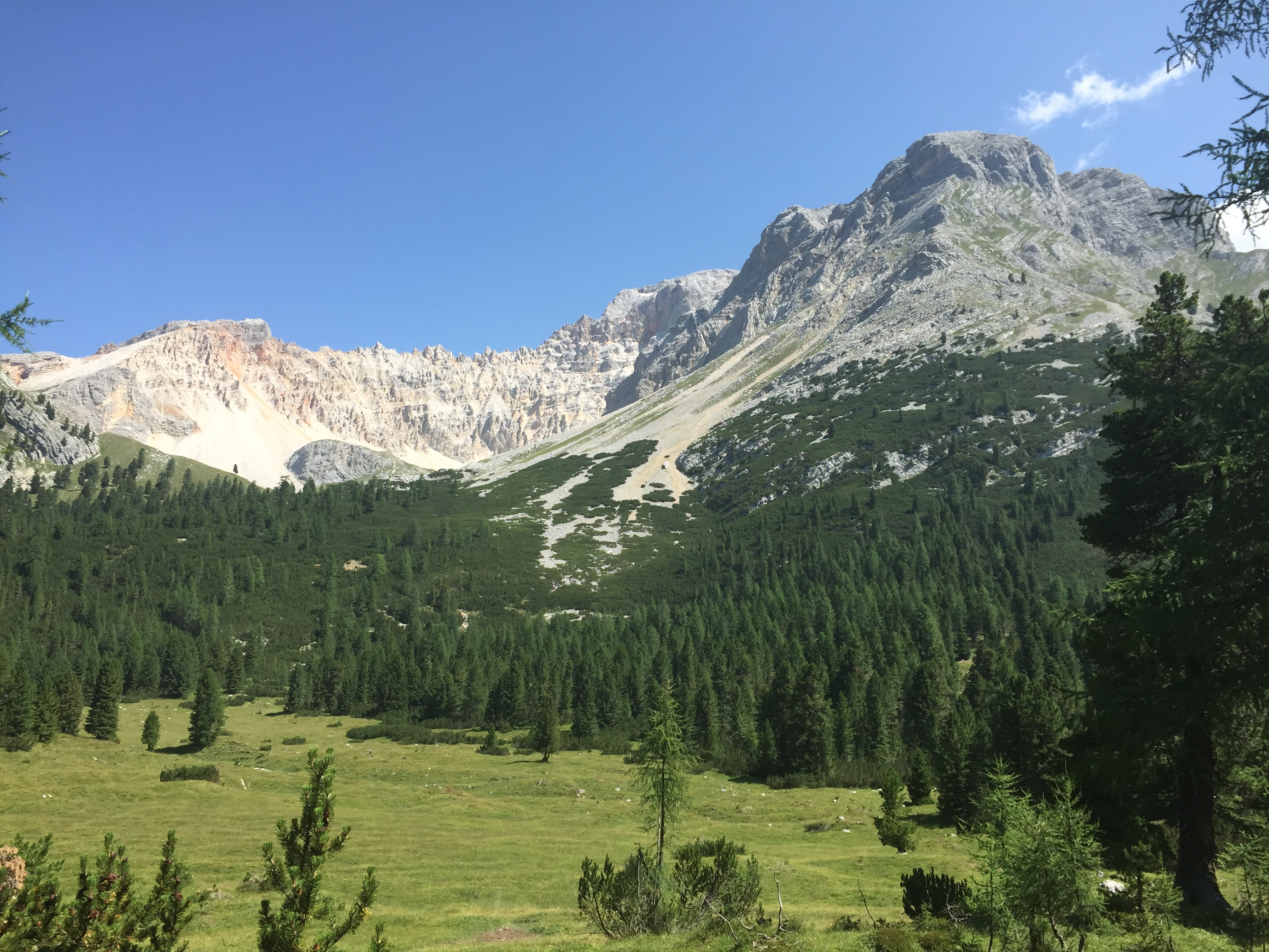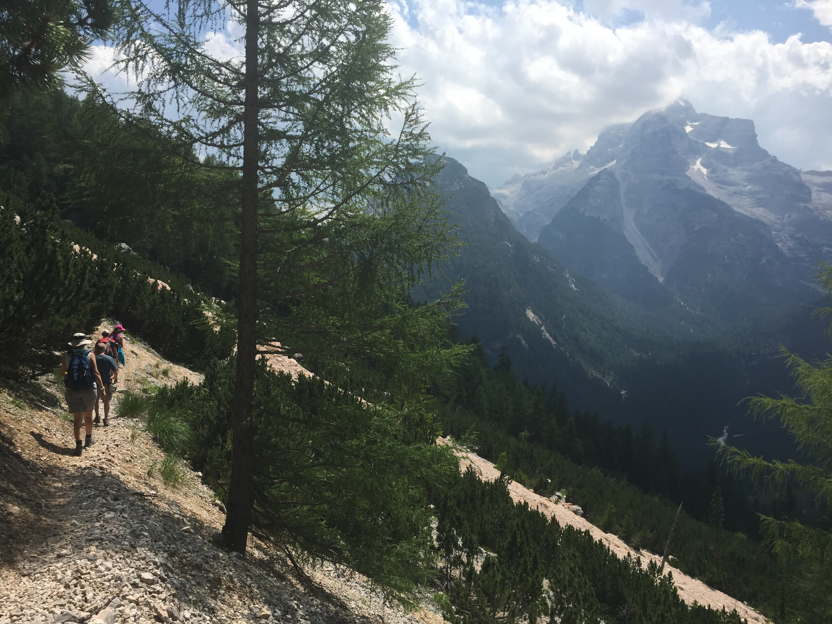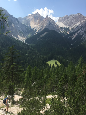 We only had to hike a short way before we came to the edge of the drop into the valley and could see the highway far below. We had great views in all directions, dominated by the huge mass of Monte Cristallo. The trail started to descend, gradually at first, then getting steeper. Eventually it got really steep, with loose dirt that meant that you had to take every step very cautiously so you wouldn't slip. The views were fantastic all the way down, but it was hard work and slow going to keep in control and avoid falling. No easy downhill stroll at the end of the hike. The steep descent to the valley seems to be a trademark of Dolomite hikes.
