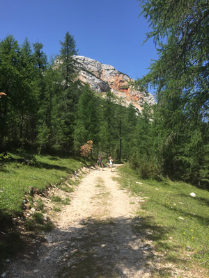 About half way between San Candido and Cortina, just after crossing the Passo di Cimabanche, the van dropped us off to begin our hike. Marco, Regina, Randy, Sandy and I started up the trail while Iris drove her car three quarters of a mile further down the road to another trailhead which was where we would come out at the end of the day. She parked her car there so it would be waiting for us when we finished our hike. Then the van picked her up and drove her back to the original trailhead that we had started from and dropped her off. Now we were set up for a through hike. After all the shuttling, the van continued to Cortina to drop our luggage off at the hotel where we would be staying. Iris had to hustle to catch up to us since we had a head start. She didn't have to hustle very hard though as we were content to take our time and hike slowly after our big day yesterday.