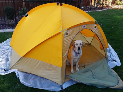 Personally, I thought it smelled pretty musty after being in storage for so long. I guess I don't have Abby's discriminating nose. So I ran both the tent and the fly through the washer. Not the best thing to do with a tent but I figured that I had nothing to lose. Afterwards I set it up in the backyard for a couple of days. That wasn't easy. Before Abby had shied away from the tent. This time she was trying to climb inside when I only had it half way put up. With her help it took me three times as long to put up the tent. I finally got it up and left it open so the air could in and it could dry out.