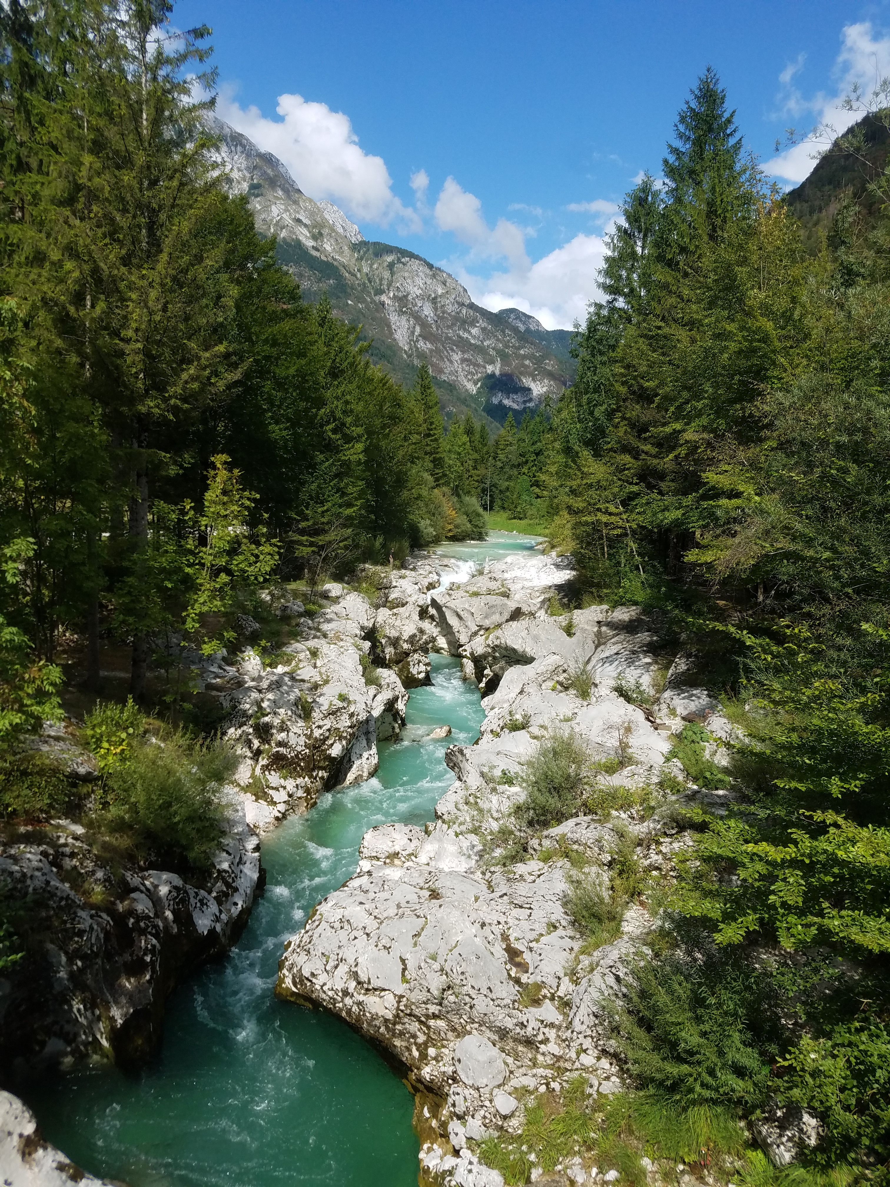 After our walk along the river it was finally time for lunch. We drove to a campground where we had another traditional Slovenian meal. I was getting tired of the local food but by now I was pretty hungry. We got to enjoy our lunch sitting in the sun because the weather had changed once again. While we let our food settle we wandered down to the Soca River where it ran just below the campground. It was a very pretty stretch, the water a translucent green color as it rushed through a narrow channel carved in bright white limestone.
