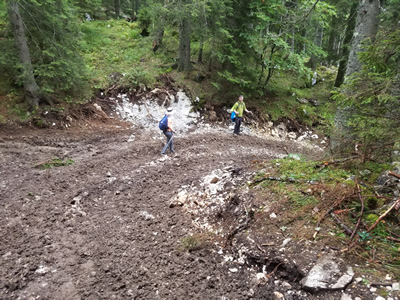 The last hour we descended another forest road. The surface of this one had been ripped up as well by the excavator, leaving a layer of loose dirt about three inches thick on top. Except that after the rain we had earlier in the day, that layer turned completely to soft, slimey, sticky mud. (Feel free to add even more adjectives here. How about gooey? Slippery? Use your imagination.)