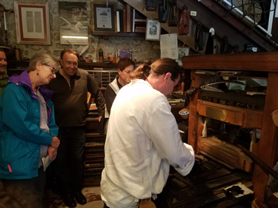 Fortunately it had stopped raining because we were outside for much of the time that we were touring the castle. We did start inside with a demonstration of a replica of Guthenberg's original printing press. You could get a custom flyer printed with a picture of the castle and your name and the date. It looked pretty cool but we already have way more stuff to hang on our walls at home than we have wall space. That's what happens when one of the people in the house is a quilter.