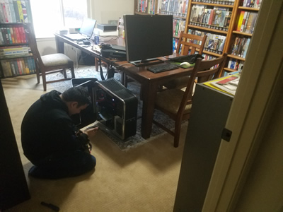 Ivan suspected the big electrolytic capacitors on the power supply were causing the problem. Sure enough, when we took out the power supply and opened it up, it looked like some of the caps had failed. That was actually a good thing since the power supply was about the easiest thing to replace. I went online and found a replacement at Best Buy that was in stock. A quick trip and an hour later we were back with a brand new power supply. Both the old and the new power supplies had modular cabling so we just had to replace the power supply itself. We unplugged the old one, left all the cables in place, and plugged in the new one. Pretty soon we were ready to fire up the system with the new unit. Easy!