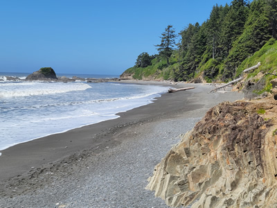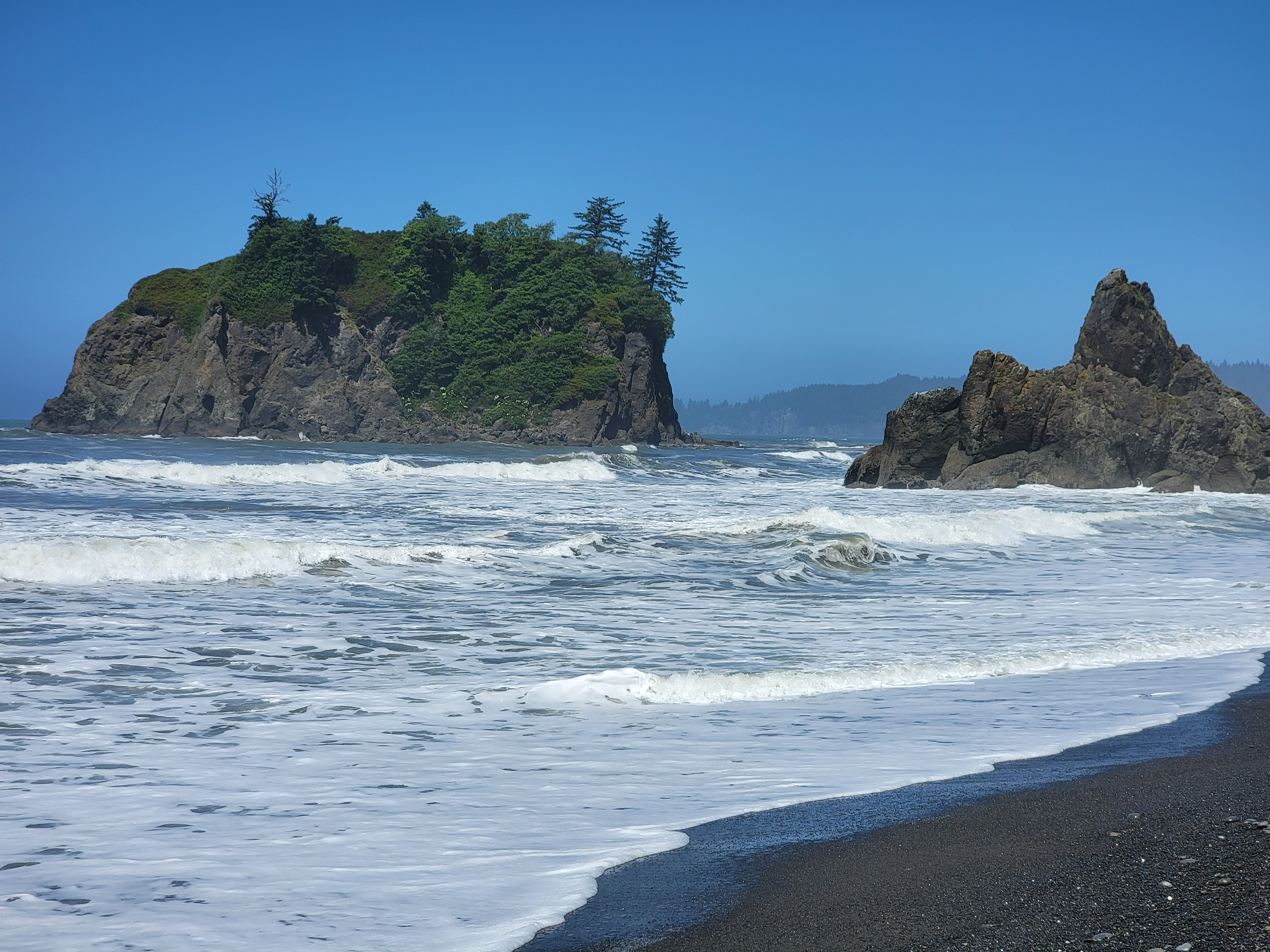 Back on US101, we continued to head south. After a while, the highway turned west all the way to the coast, where there was a turnoff and a parking lot for Ruby Beach. We decided to stop and check it out. It was a short walk down to the beach, only a couple hundred yards. Because it was so accessible, there were quite a few people there. I could understand. It was another perfect day and the scenery was fantastic. There were a number of sea stacks rising just off the beach. Behind them was Abbey Island, a rocky monolith with hundred foot high cliffs on all sides. Abby should feel honored to have it named after her.