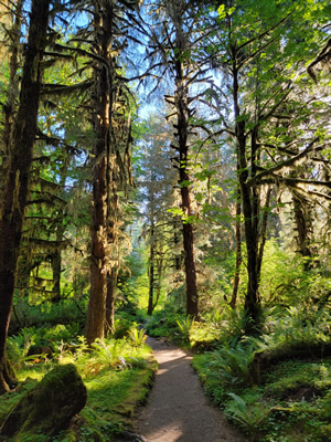 The Hoh valley has some of the most famous rainforest in the US. A trail runs beside the river for over twenty miles to its headwaters, deep in the Olympic Mountains. We didn't intend to go that far, but wanted to see the rainforest and hopefully get some views of the most remote peaks of the Olympics. The trail was easy. It follows the river and is very flat. The rainforest was indeed impressive. It was incredibly lush. Everything, everywhere, was green. Even the sunlight seemed to have a greenish tint. But we had seen a lot of rainforest on our hikes the day before. Unfortunately while we got to experience the forest, there were no views. The forest was too dense. We never saw the mountains. Even the river, sometimes only a hundred yards away, was still hidden by the dense forest. We could hear it but we couldn't see it. There was no specific destination, so we hiked for about three miles before turning around.