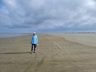 Hotels line the road that is closest to the ocean. Behind them is about a 500 foot stretch of sandy scrubland. It seems like it is just beach that is out of the reach of high tide, allowing grasses and shrubs to colonize it. Beyond that is the beach. It is impressive. It is about 200 feet wide and very flat. It extends out of sight in both directions. It's quite a contrast from the beaches we had been on just a few days before, which were backed by cliffs and steep forested slopes. At Ocean Shores there are just no features anywhere, on the beach, behind the beach, or inland.