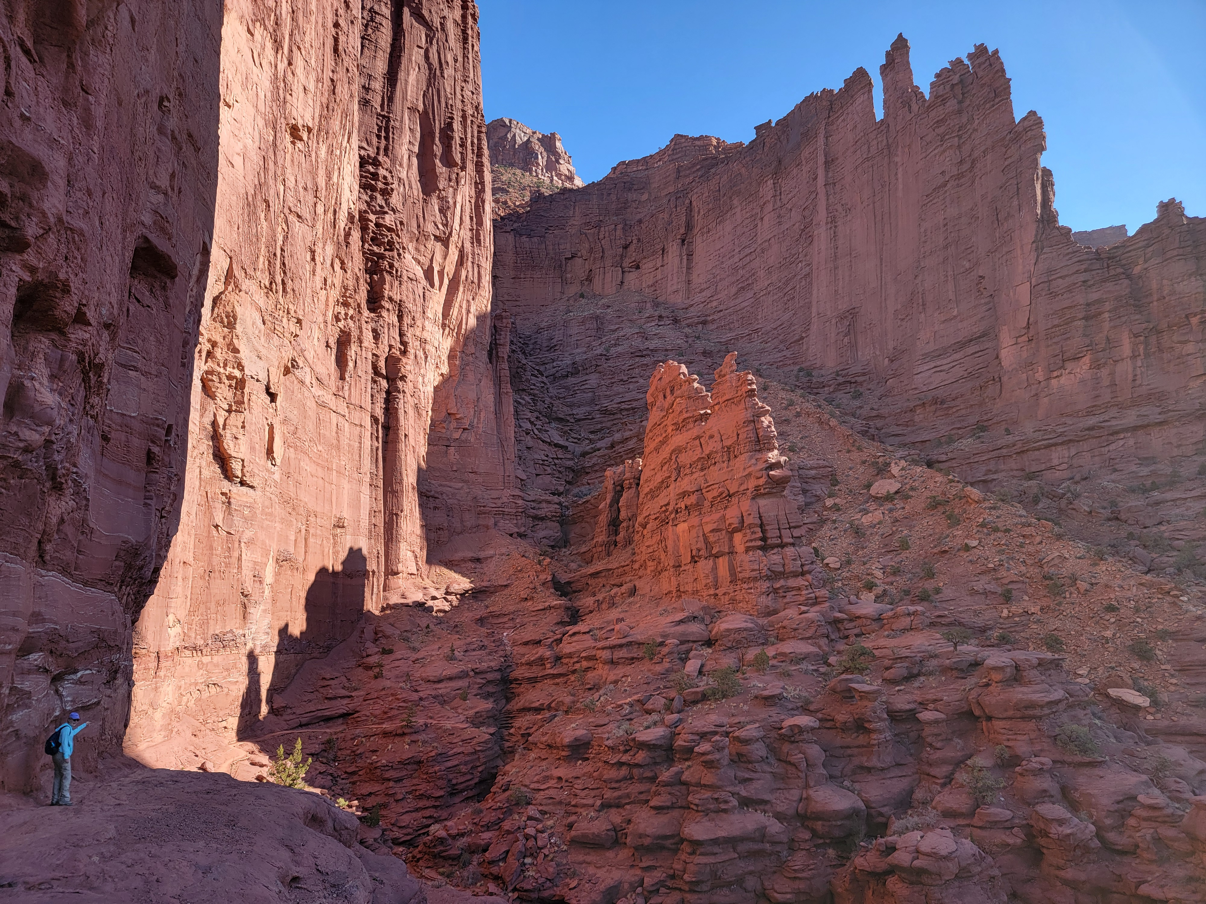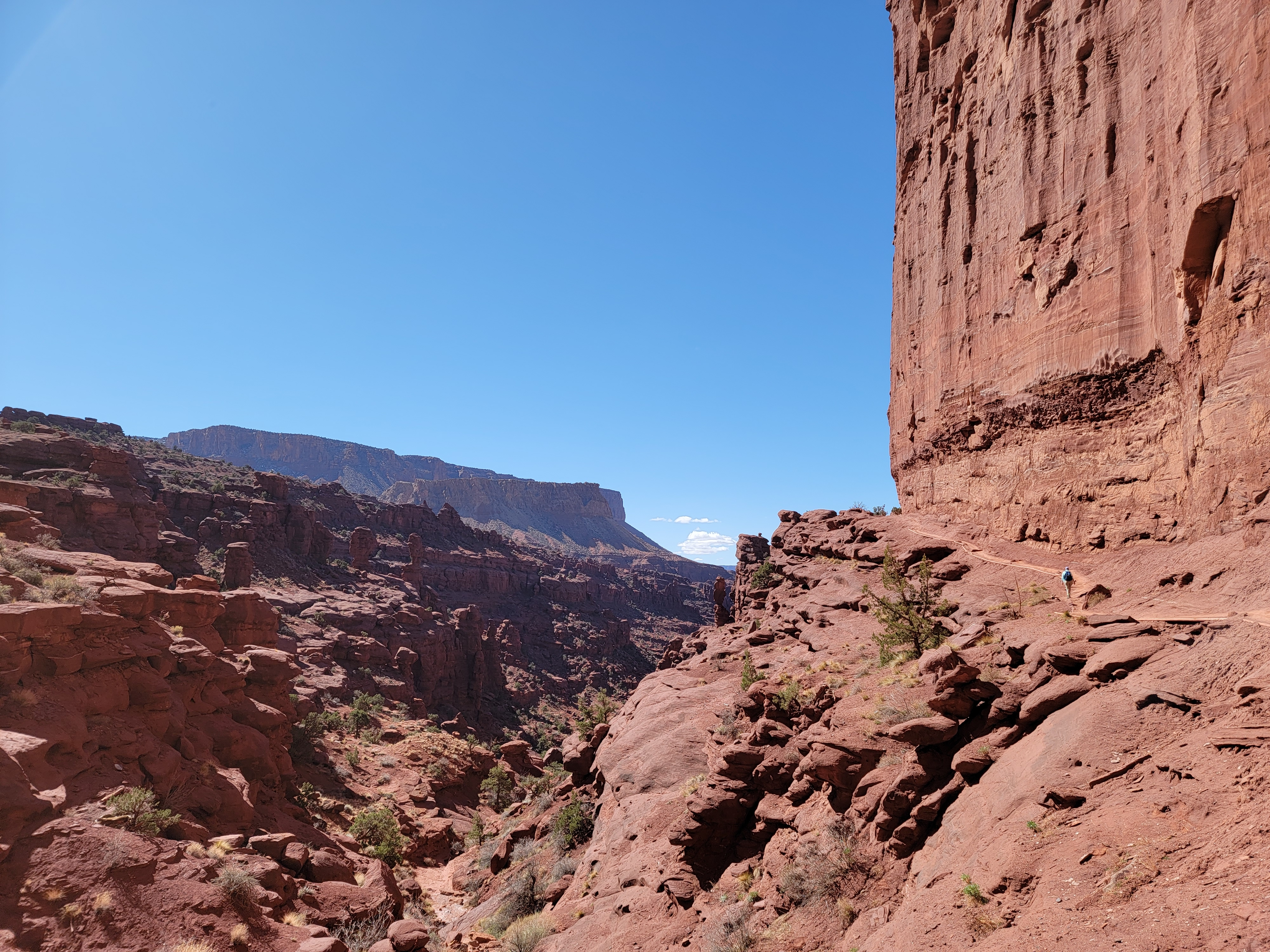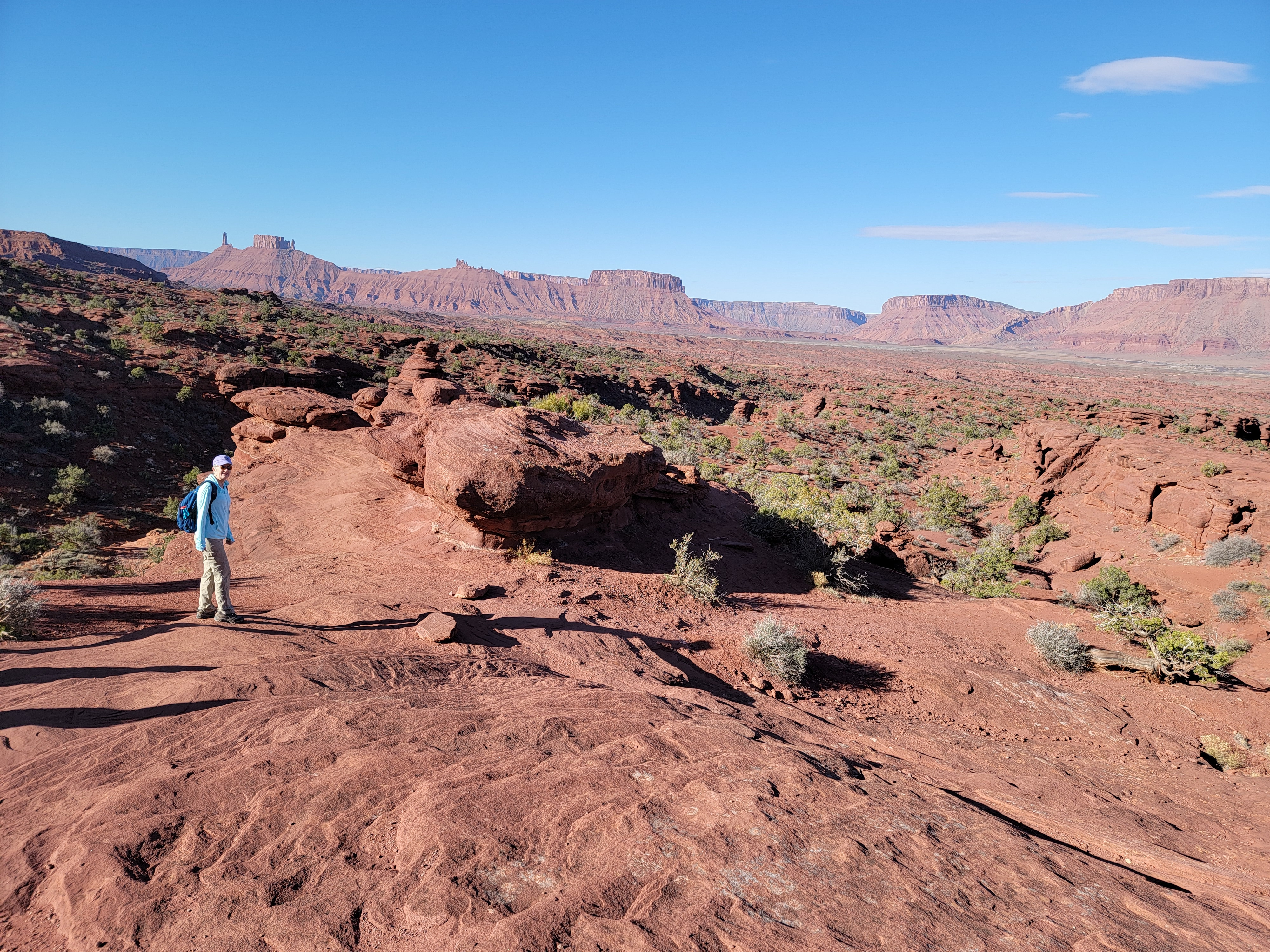 As promised, the next morning there wasn't a cloud anywhere in the sky. We drove out of town and turned east on Utah 128 at the Colorado River. It's a pretty drive. The highway follows the river through a narrow canyon which widens as you go farther up river. When we reached our turnoff, it was about a mile on a good dirt road to the trailhead, about 45 minutes total from our hotel.