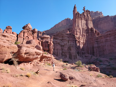 The reality of the towers was something else though. They aren't steep. They are STEEP!!! And after approaching through the wash, the trail wound right along the side of them. On one side was a long drop into the wash while on the other side a sheer cliff rose hundreds of feet above us. The tallest of the towers, the Titan, is indeed impressive. It rises 900 feet from it's base. It is considered the steepest peak in the United States and the largest free-standing, natural tower in the country.
