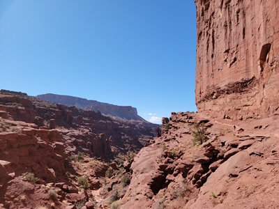 Besides the scenery, the hiking itself was interesting. A lot of it crossed over slickrock, which I always enjoy. At one point, the route rounded a corner where the trail got very narrow with significant exposure on one side. It wasn't too scary but it did require care to negotiate. A little farther along, a narrow gully cut across the route. We needed to stretch along the edge to grab a ladder, climb down about ten feet, and then scramble up rocks on the other side to regain the trail. Definitely more interesting than a slog where you just put one foot in front of the other over and over again.