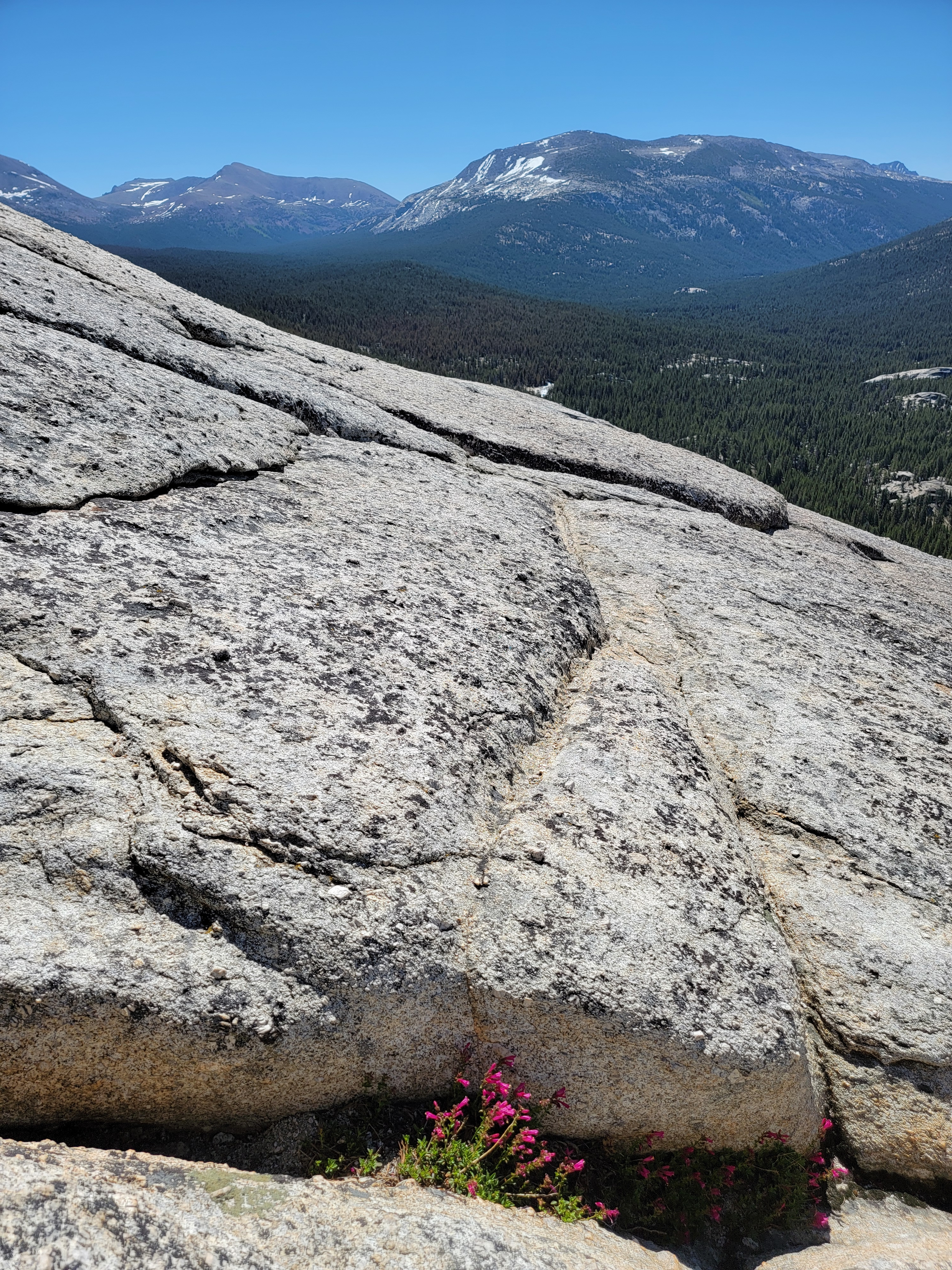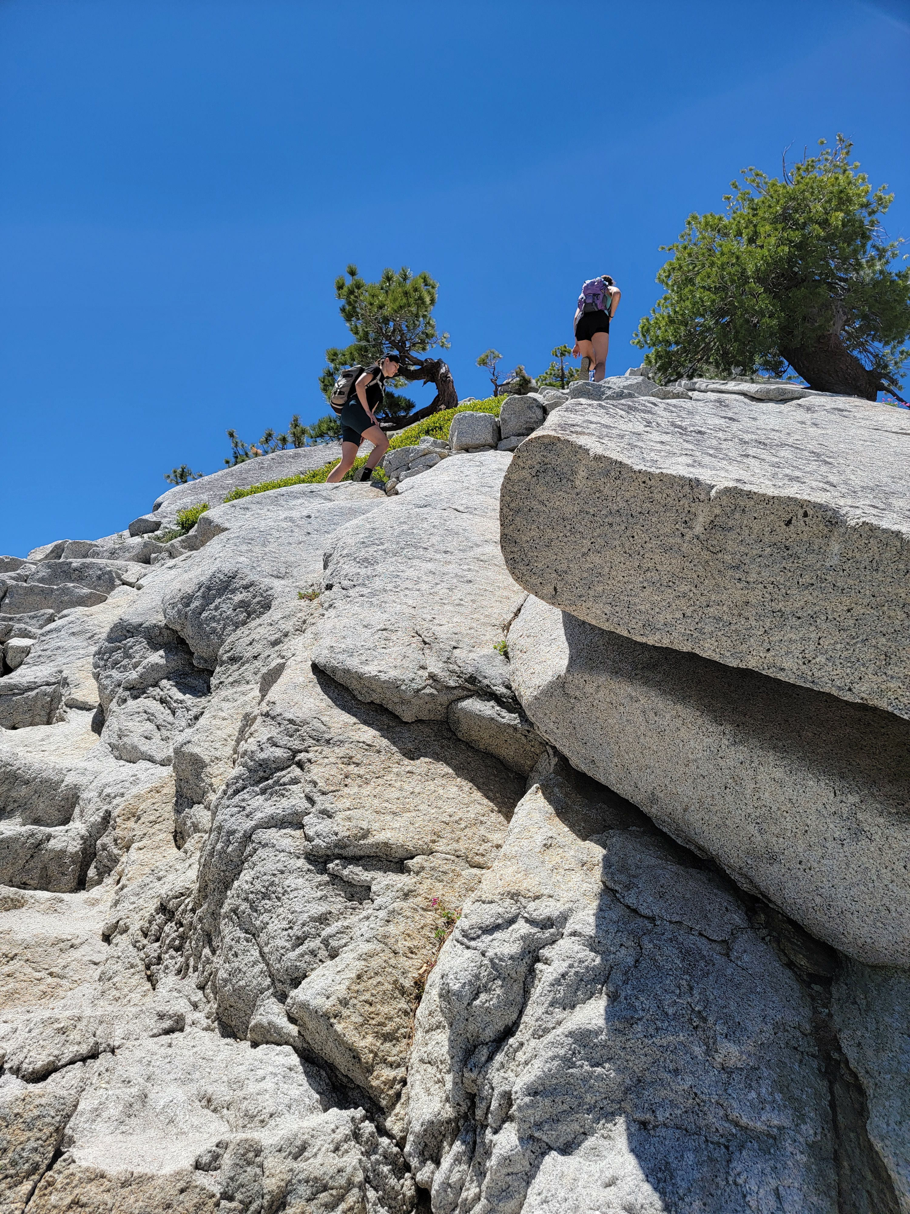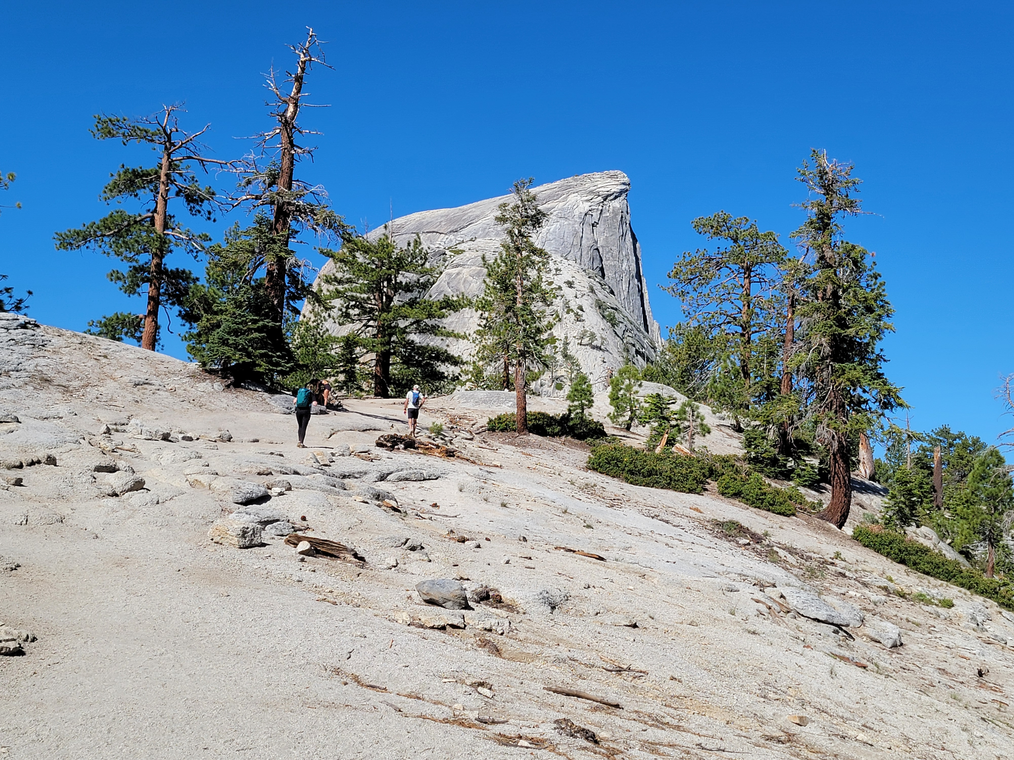 The trail ends at the base of the subdome. From that point on, I was hiking on granite. The subdome is steep and there is some mild exposure. Some of the guides that you find on the internet say that the subdome "is a serious scramble", but I didn't think it was hard to find a fairly easy route up it by taking reasonable care. Part of the way up is on steps cut into the granite. Part of the way is up slabs. Yosemite granite is hard and provides a lot of friction when walking up slabs. As I had done all day, I just took my time.
