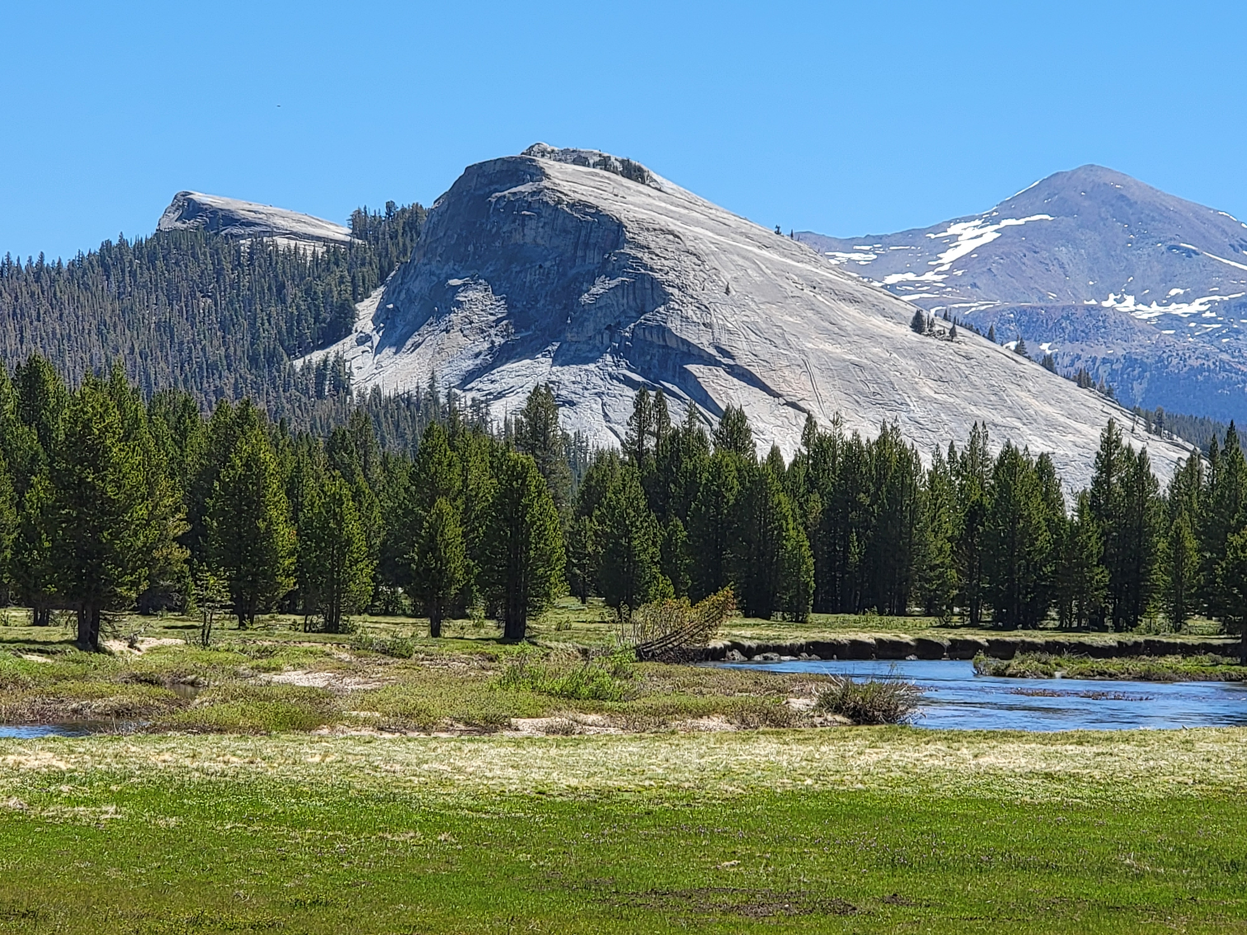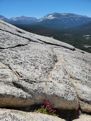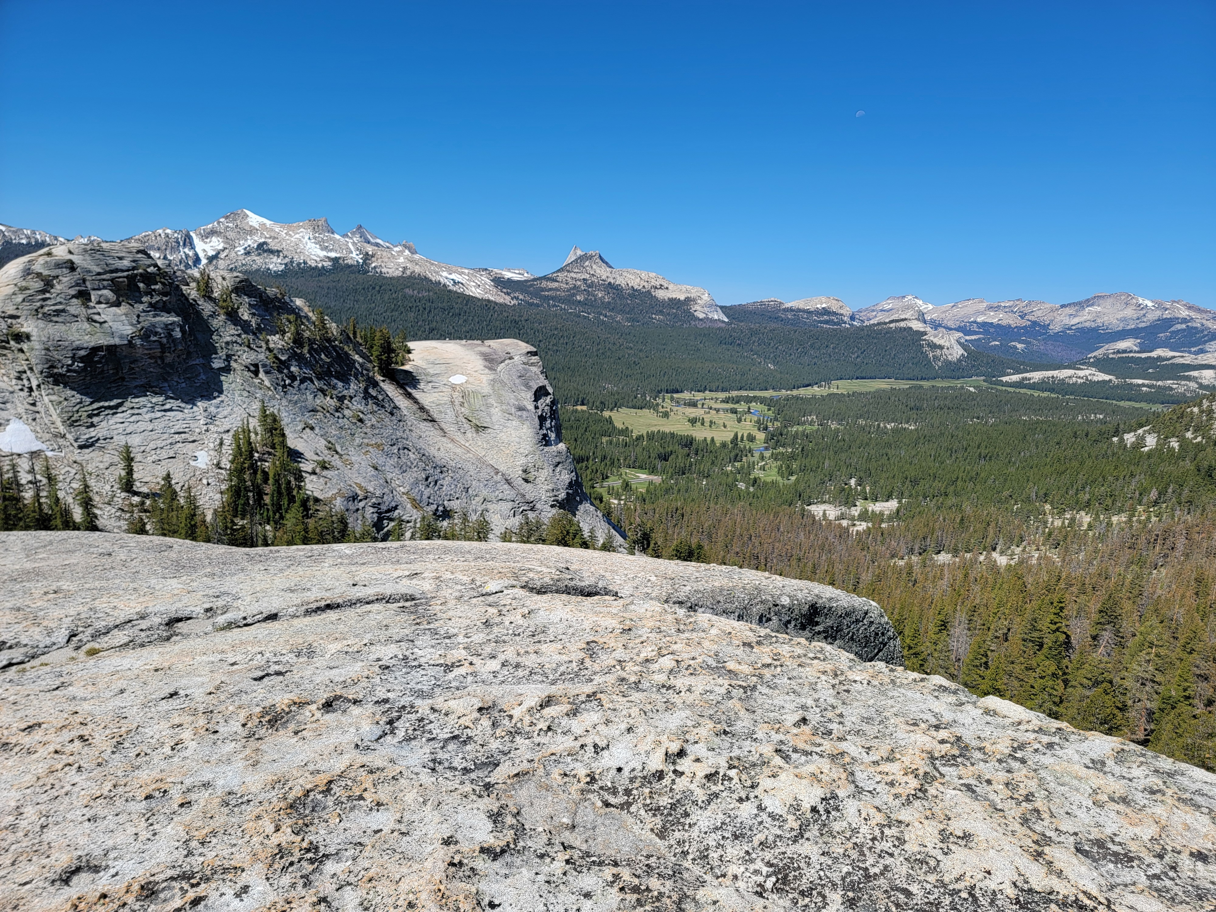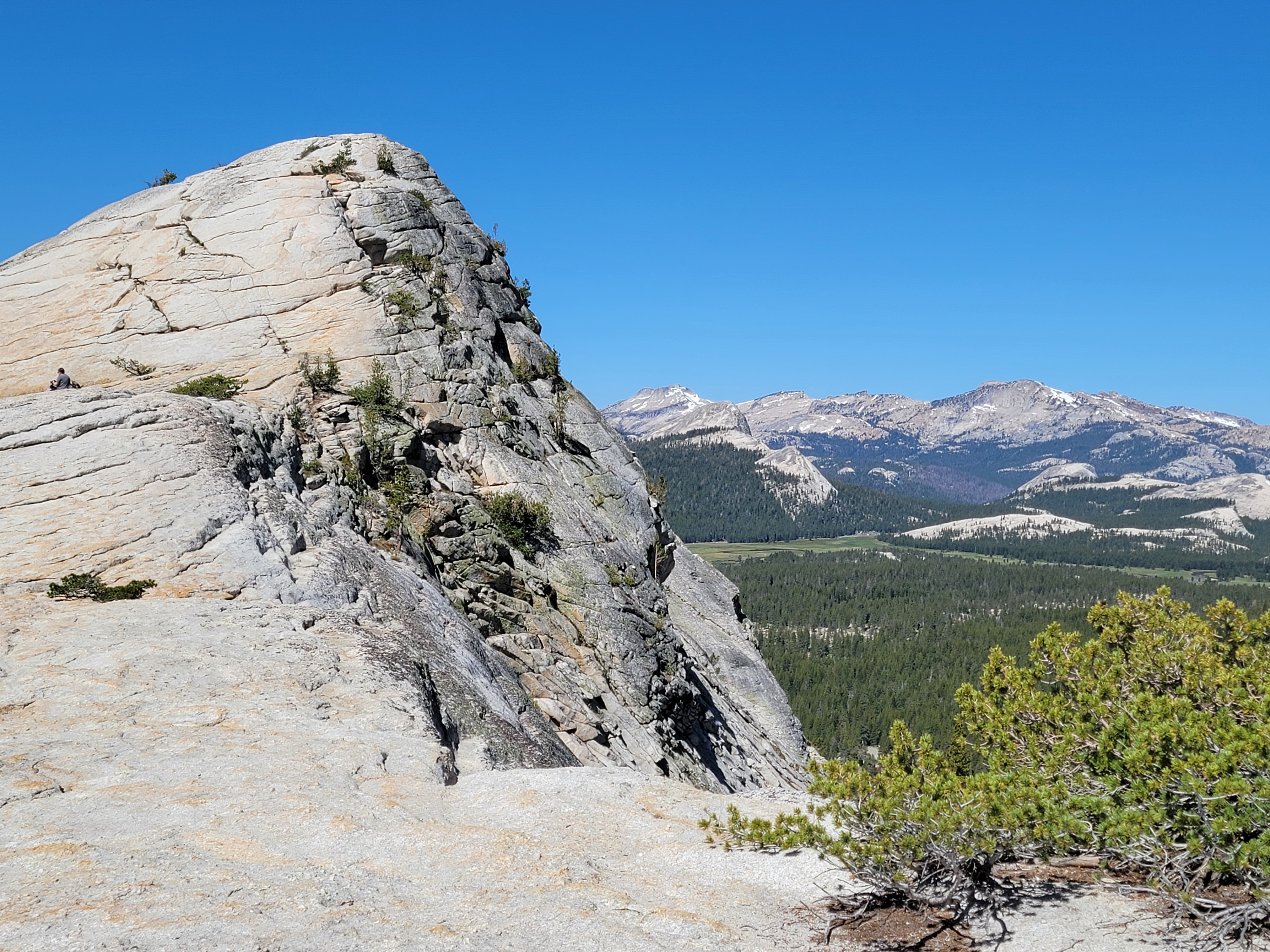 After checking out the Visitor Center in Tuolomne Meadows, I parked at the Lembert Dome trailhead. It's a fun hike to the top, about a mile long and 700 feet of elevation gain, The last third is on the granite of the dome, which steepens considerably as you get near the summit. Going straight up is a significant scramble, although not too difficult. I was feeling lazy today, so I traversed around about 120 degrees to where the slope was less steep. The view from the top is spectacular and going up the steep granite slabs near the top was good practice for tomorrow's hike up Half Dome.