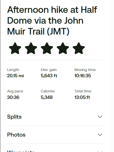 My stats from my GPS and the AllTrails app were 20.15 miles and 5,643 feet of elevation gain. From when I left my car till I got back was exactly 13 hours, even though my GPS said 10:16. It only counts time that you're moving and not when you stop. Apparently it thought the hour I spent struggling up the cables was just a long rest break.