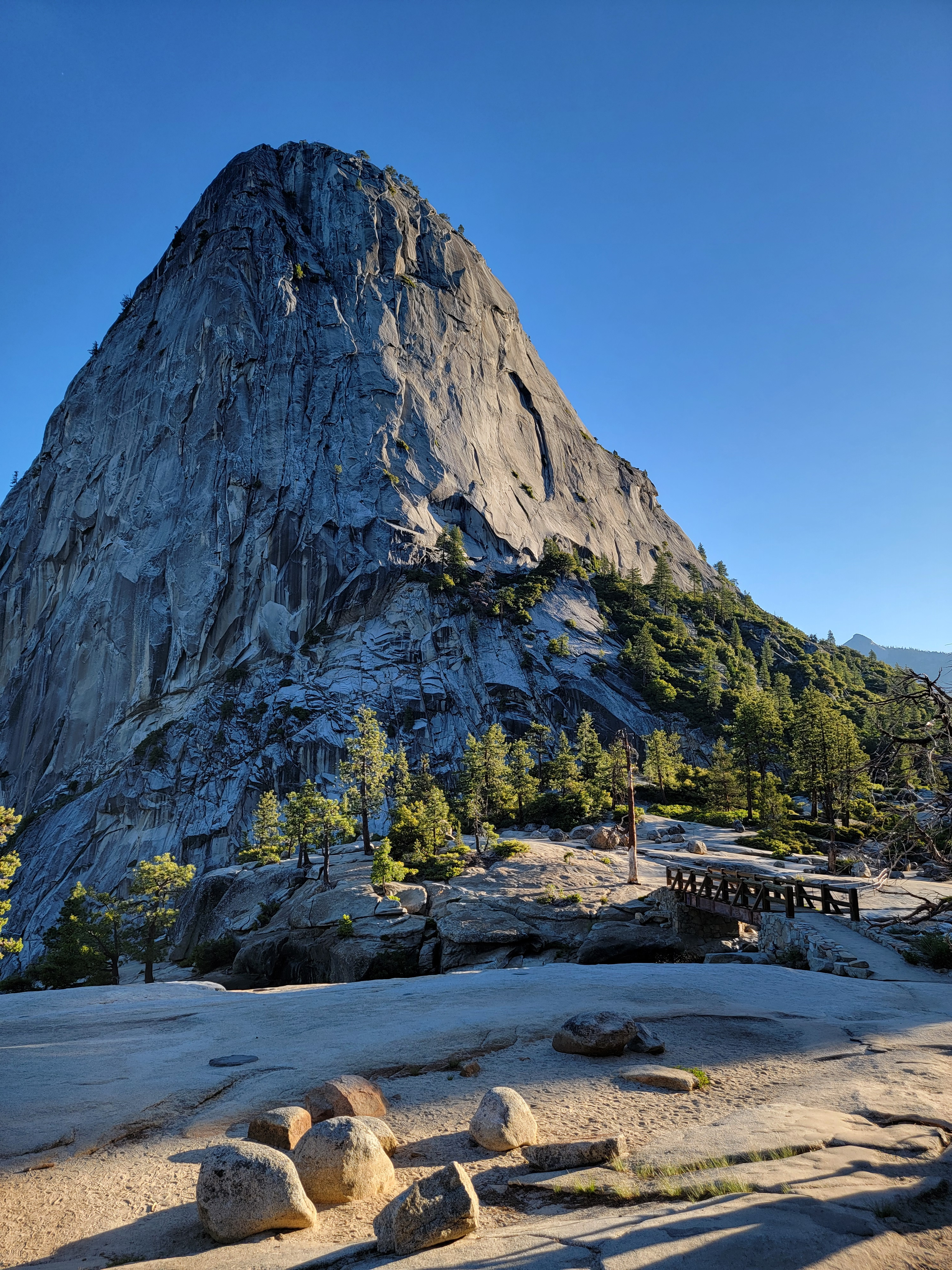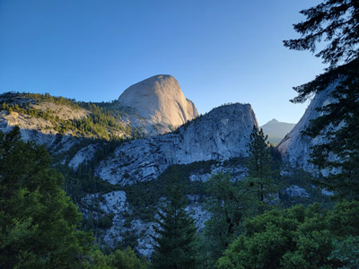 Just over three quarters of a mile from the trailhead I crossed the Vernal Falls footbridge. Not much past that was a trail junction and a decision point. The Mist Trail ascends along the river. It's very steep. Much of it is stone steps. The alternative, the John Muir Trail, has a series of switchbacks that ascend more gradually. The two trails join again above Nevada Falls. The JMT adds three quarters of a mile in each direction, but I opted for that. The name of the Mist Trail should be a dead giveaway. You usually get soaked by spray from the falls and the river. The stone steps are slippery when they are wet, and they are always wet. There is also some exposure, and I would be going up in very faint, early morning light. Much as I hated to add mileage to what was already going to be a very long day, I took the John Muir Trail. Maybe it wasn't as steep as the Mist Trail, but I thought it was still pretty steep. I just took it slowly. As I climbed higher, the sky gradually got lighter. By the time I reached Clark Point, the first viewpoint where I could see Half Dome, the morning sun was already shining on it.