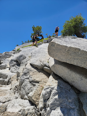 It's four hundred feet of elevation gain to the top of the subdome. When I reached the top the view of the mountains all around was amazing. But my gaze was fixed ahead of me. A slight dip led to a small saddle where a number of people were clustered. Beyond that was the steep granite slope that led to the summit of Half Dome. It's the grand finale, the famous cable route. The first view of it is quite striking. Some people are intimidated. Some are excited. But no one is unaffected when they first see it.
