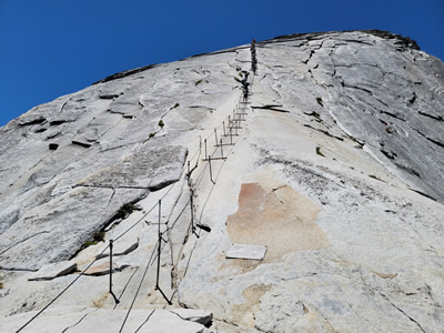 The final four hundred feet to the summit is up a single 45 degree granite slope. Without aids, it would be a roped rock climb as a fall could be fatal. To make it accessible to hikers, there are two steel cables that run down the length of the slope. They are held up by stanchions so that they are at waist height, about four feet apart. They're close enough that you can hold one cable in each hand as you climb, but allow enough room for two hikers to pass each other. There are wooden planks every six to eight feet, supported by the poles. They allow you to stop and rest while on the cables.
