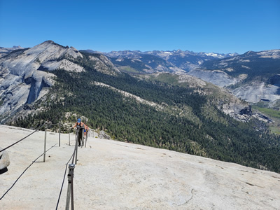 I saw that a few people were using via ferrata gear to clip into the cables. Maybe it was ten percent. Sure, the route is serious, but I thought that was overkill. I wasn't too worried. I had done it twice before and didn't think it was that bad. The rock was dry and there wasn't a cloud in the sky. You just had to be careful. I took a break at the top of the subdome and watched people on the cables for a while. Even with the permit system in place, they were crowded. Since people were going up and down, they frequently had to pass someone going the opposite direction.