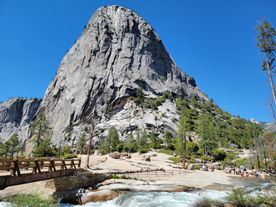 The trail flattened out as I approached the top of Nevada Falls. I crossed a footbridge over the Merced again, right at the top of the falls. It was a spectacular spot, with the huge stone monolith of Liberty Cap looming overhead and the waters of the Merced roaring under the bridge and over the falls. There was no one else here. I had this special place all to myself. It would be quite different when I reached here on my way coming down.