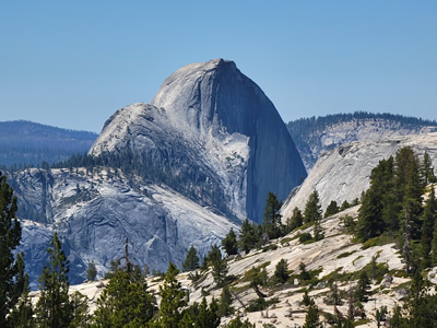 The switchbacks seemed to go on forever, but eventually I reached the crest of the ridge that extended from Half Dome to Clouds Rest. Now the scenery was getting impressive. The forest was opening up, so the views were more expansive. Over the ridge was Tenaya Canyon and North Dome. To the east was Clouds Rest. And now to the west Half Dome was visible, still a ways off but no longer impossibly far. The subdome loomed large, with the upper part of the final slope of Half Dome showing above and behind it. Still a long way to go but I was getting there.