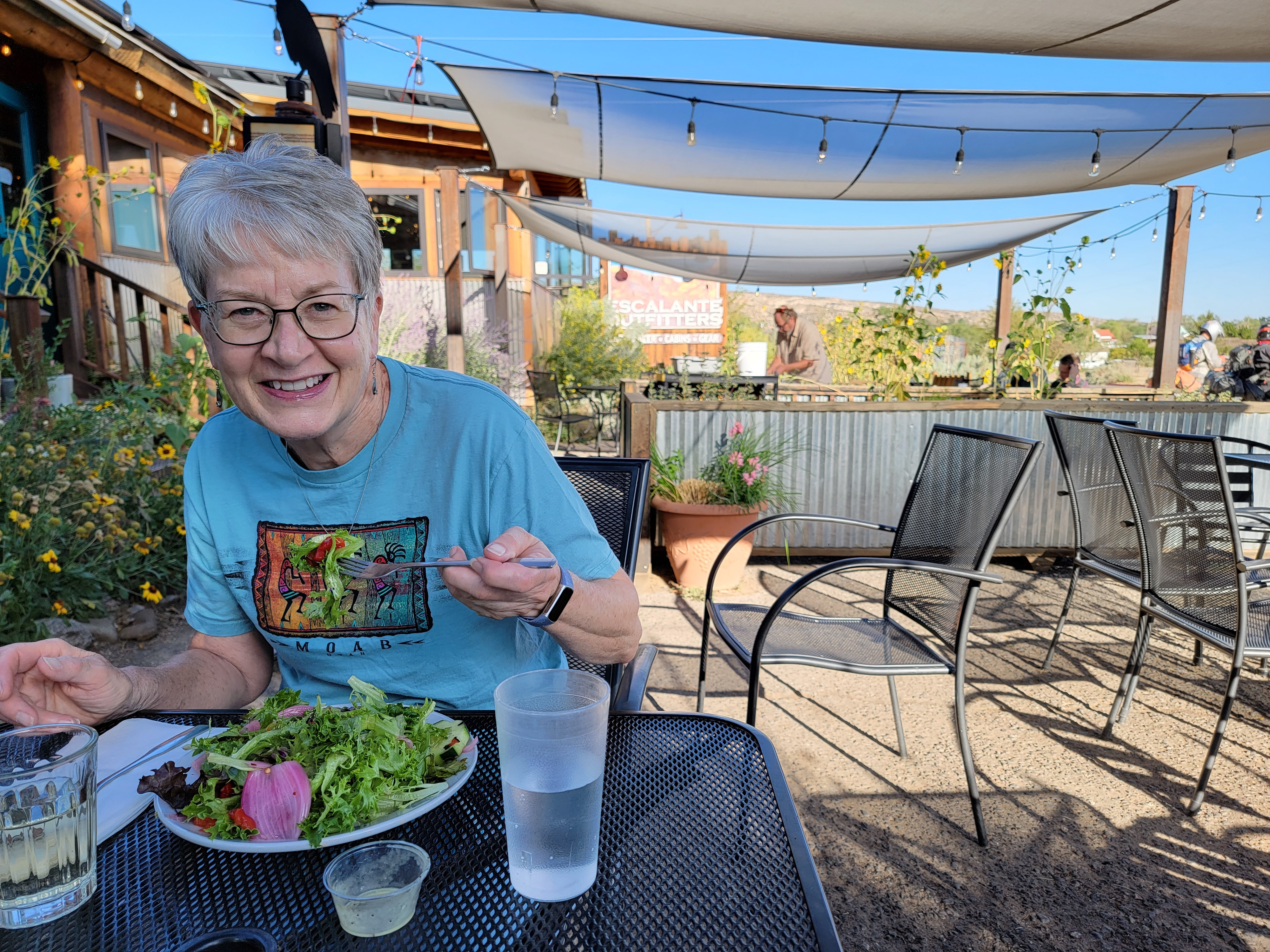Mom was still at the desk so I explained how we had ended up having to pay for two rooms for the night because of their error. Since we had paid $138 for the extra room at the Prospect Inn, she took $100 off the price of our room at the Canyon Country Inn. Not perfect, but a good effort to make things right. I was ok with that. With that settled, we went to Escalante Outfitters for dinner. It was a beautiful day so we sat on the patio. Sandy had a salad and then we shared a pizza. That night we watched the Brewers lose to the Cardinals 3-2. I always hate to see them lose to St. Louis, but at least they took two out of three to win the series.