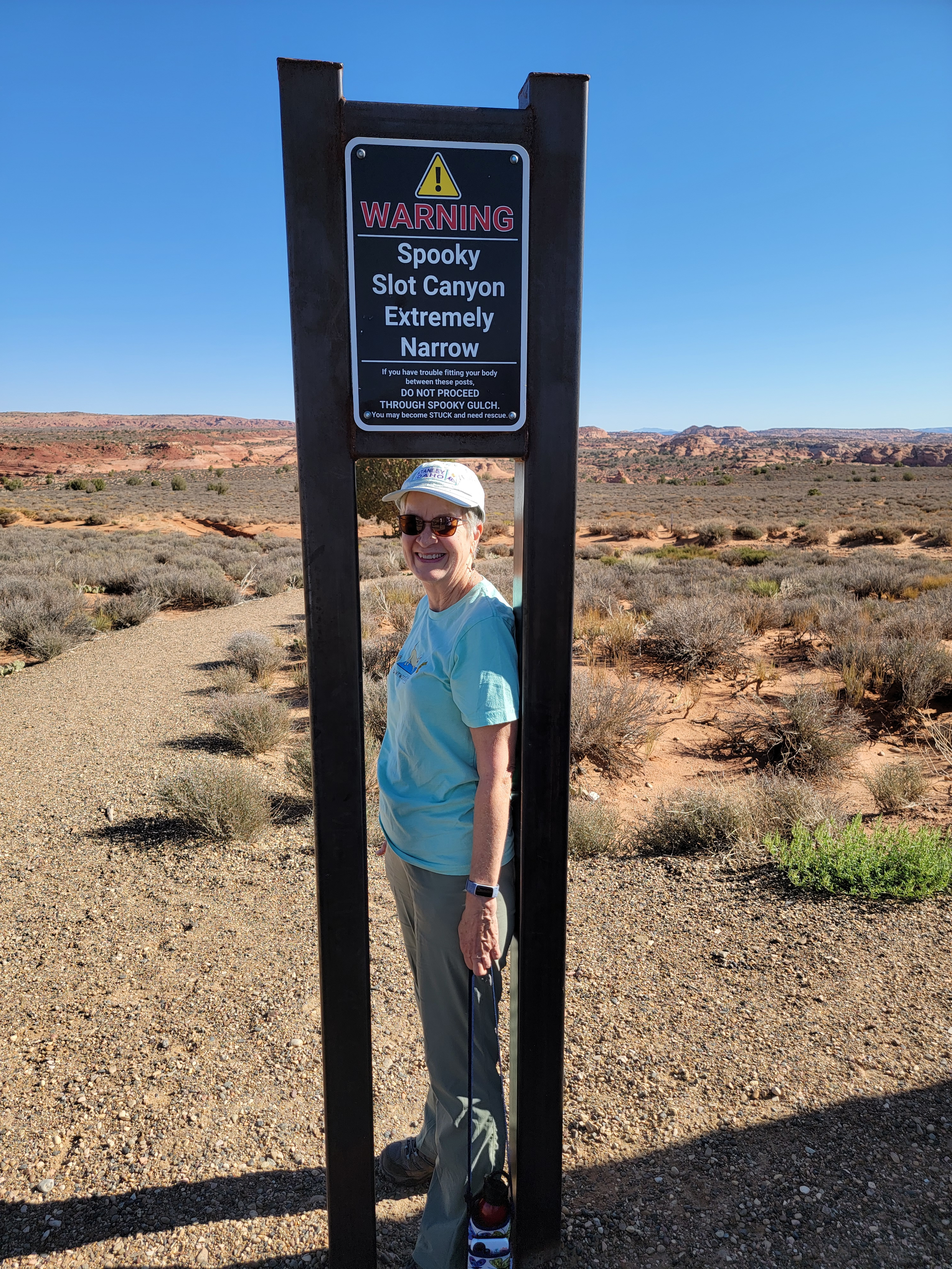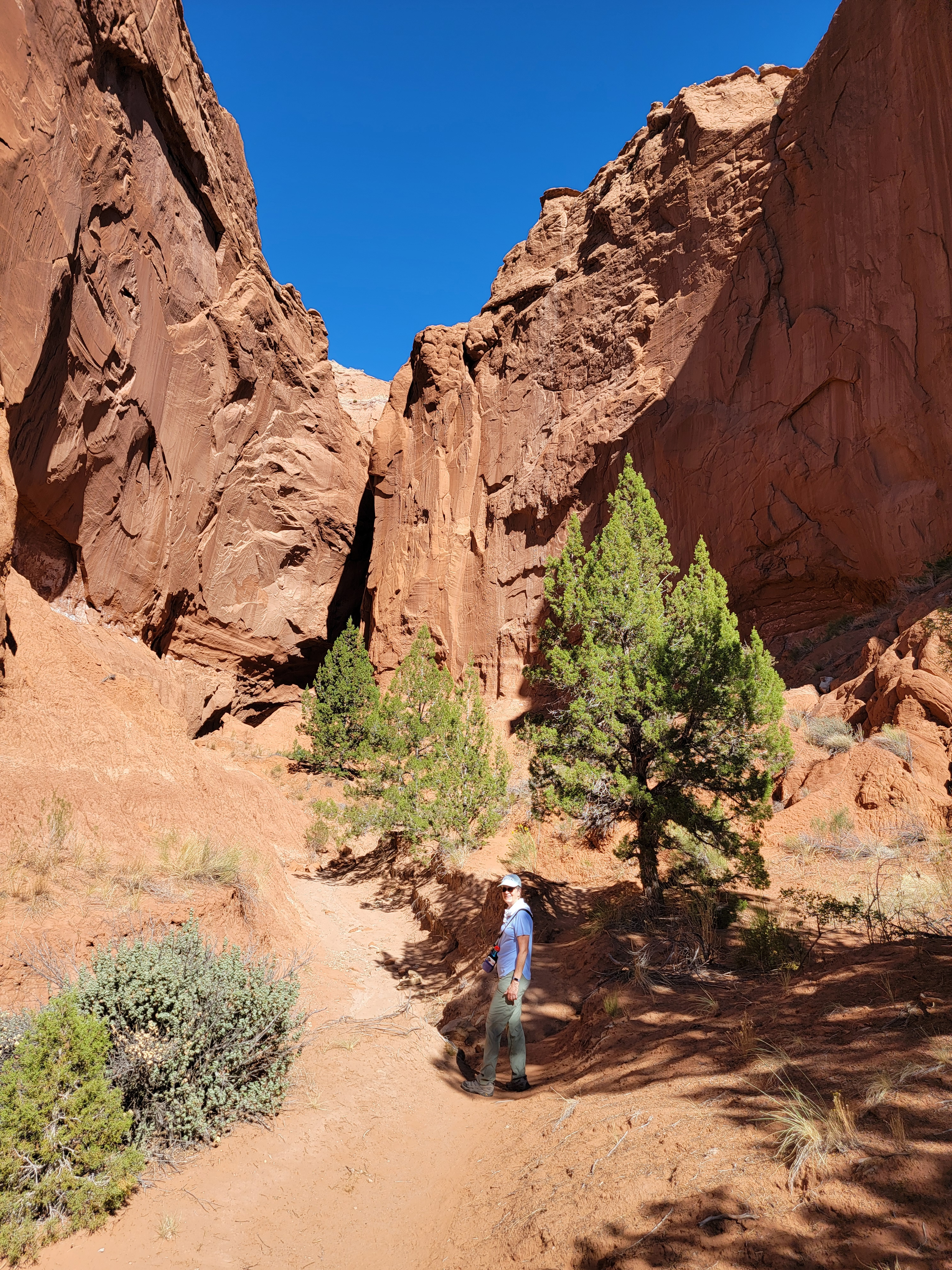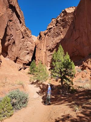 The next morning we started with a drive down the Hole-in-the-Rock Road to the Upper Dry Fork Trailhead. I had been here in March to attempt Peekaboo and Spooky slot canyons. I was unsuccessful, but the approach to them went through Dry Fork, which also has a nice slot canyon. The plan today was to do the Dry Fork Loop, which is about a three and a half mile hike, mostly flat. We'd hike through the Dry Fork Canyon Narrows and go past the entrance to Peekaboo, which is the place I got stopped on my last trip. I wanted to get another look at it because I'd like to go back and try it again some time.