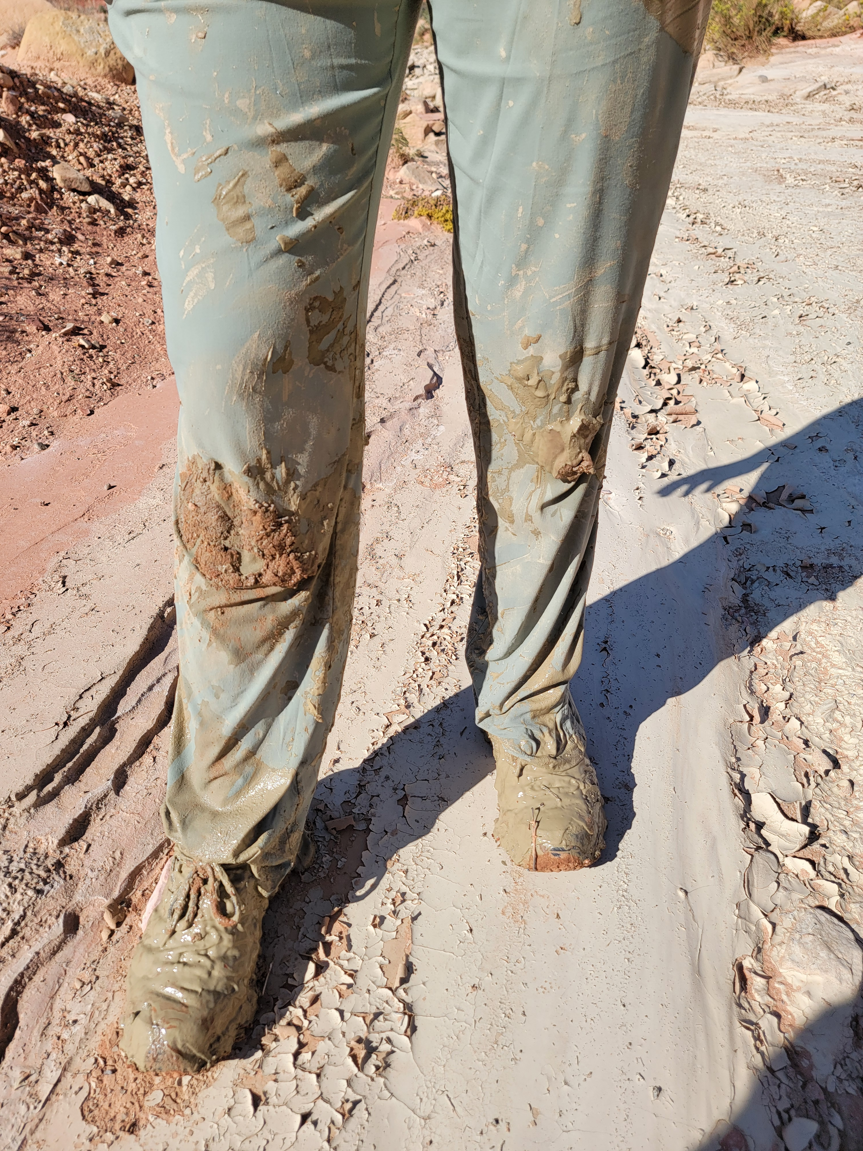While I was working my way around, very slowly, Sandy thought I was overthinking things. She just half-stepped, half-jumped off the rock step. It turned out the mud wasn't sandy soil like a lot of the wash, but soil with a lot of clay in it. The mud was an inch or two deep and was very slippery. When she landed, she slipped and pitched forward onto her hands and knees. Yuck! I told her to keep still. I was able to get to her and help her to stand up. We went back the way I had gone and got back on the rock above the mud.