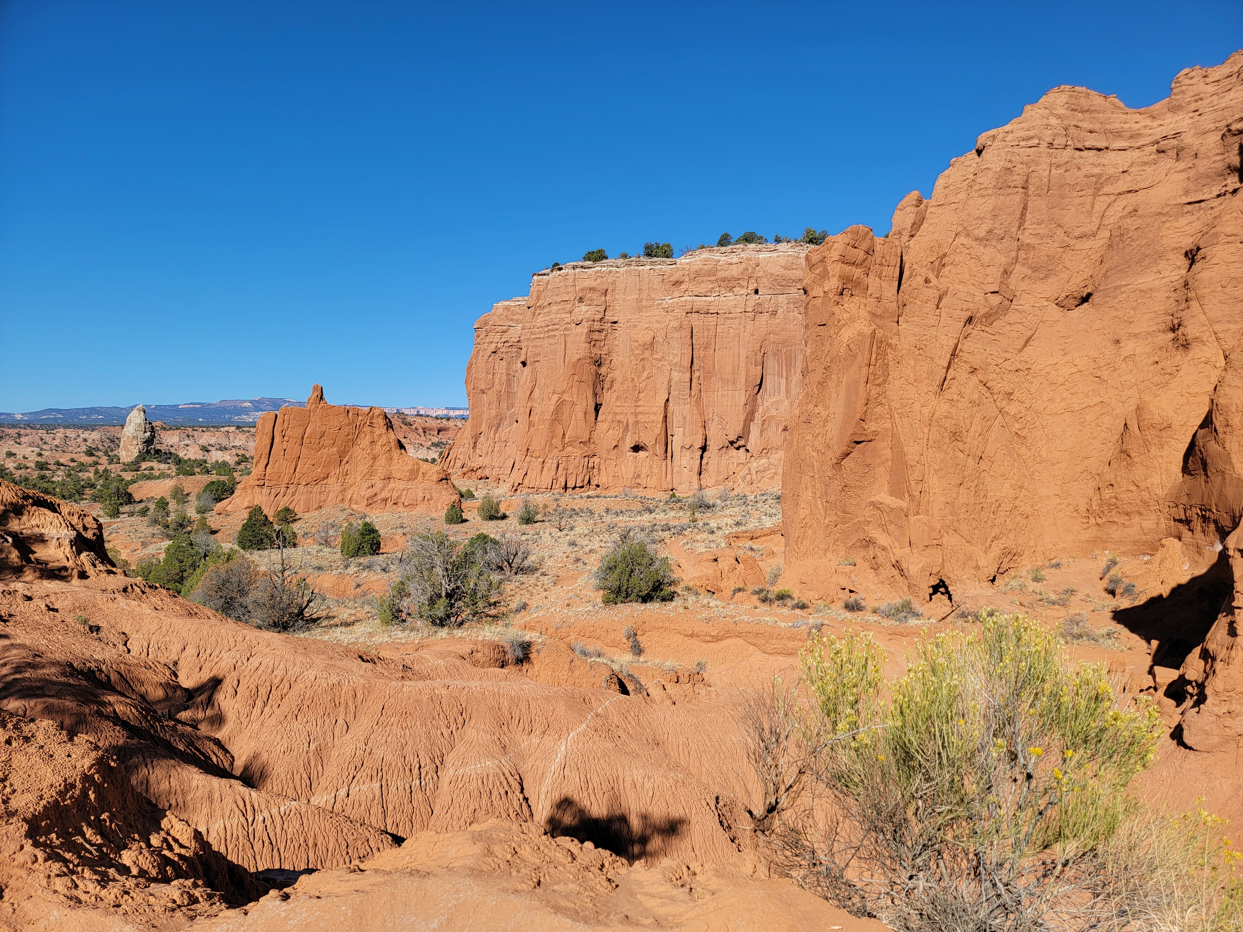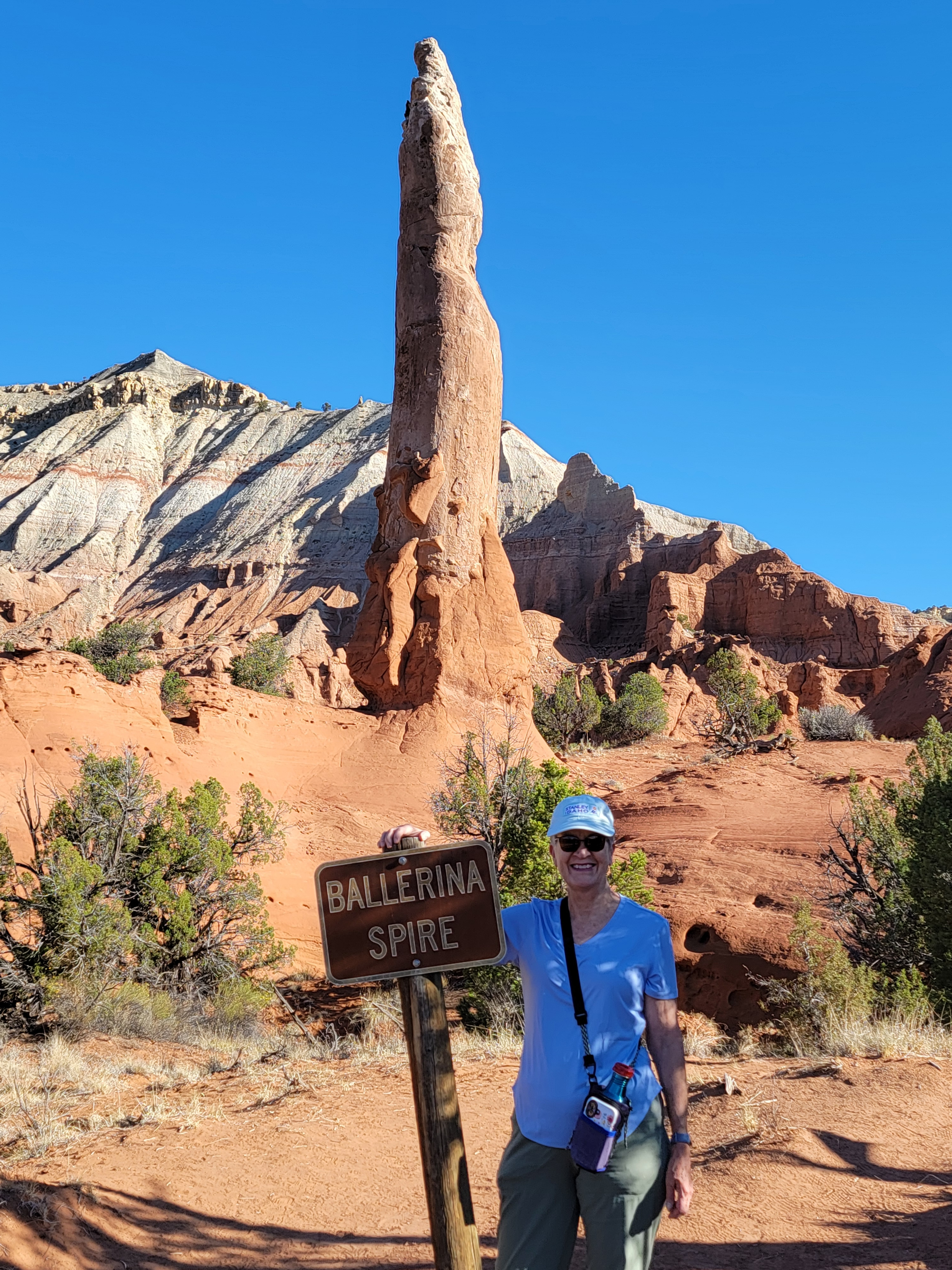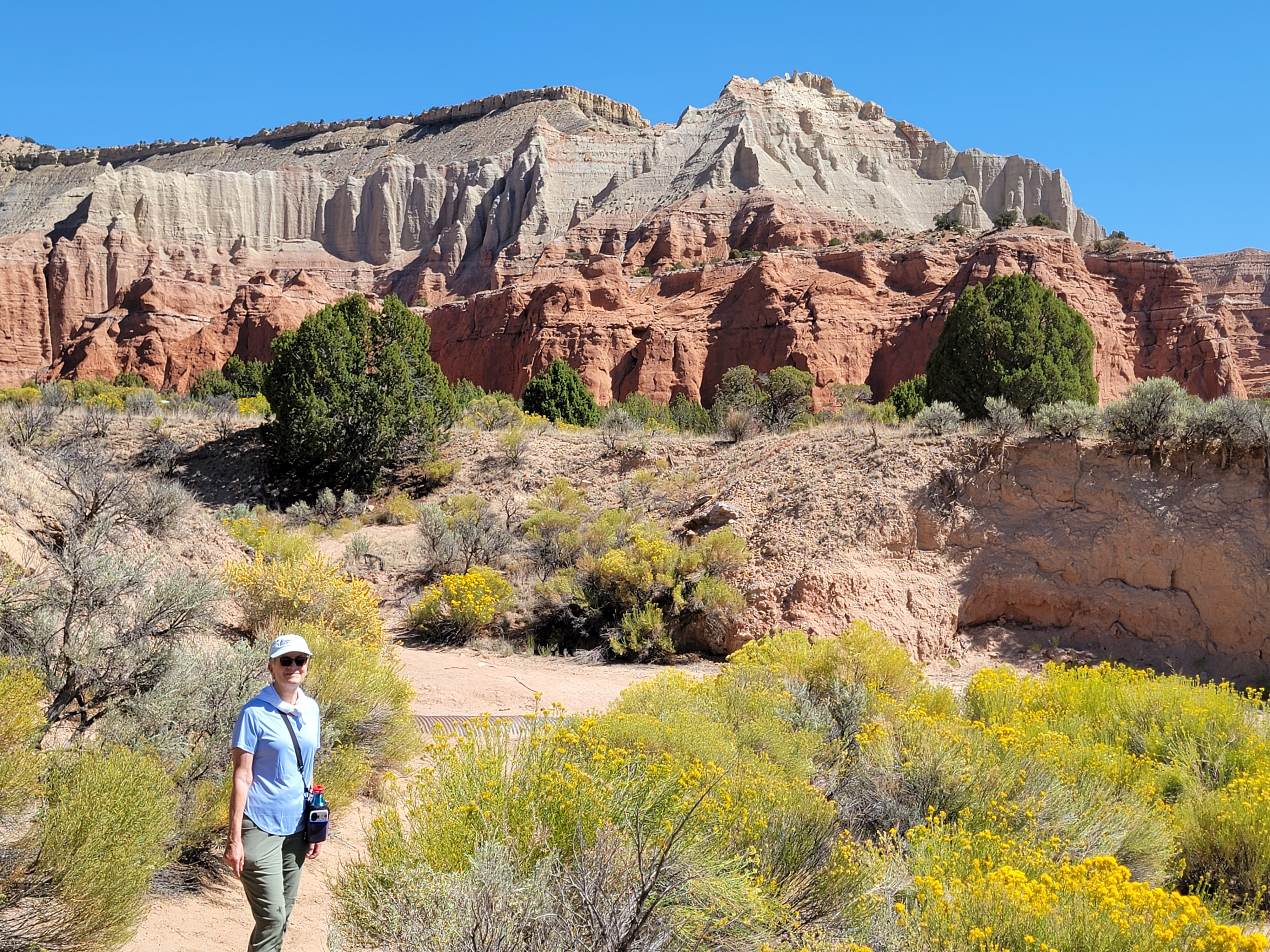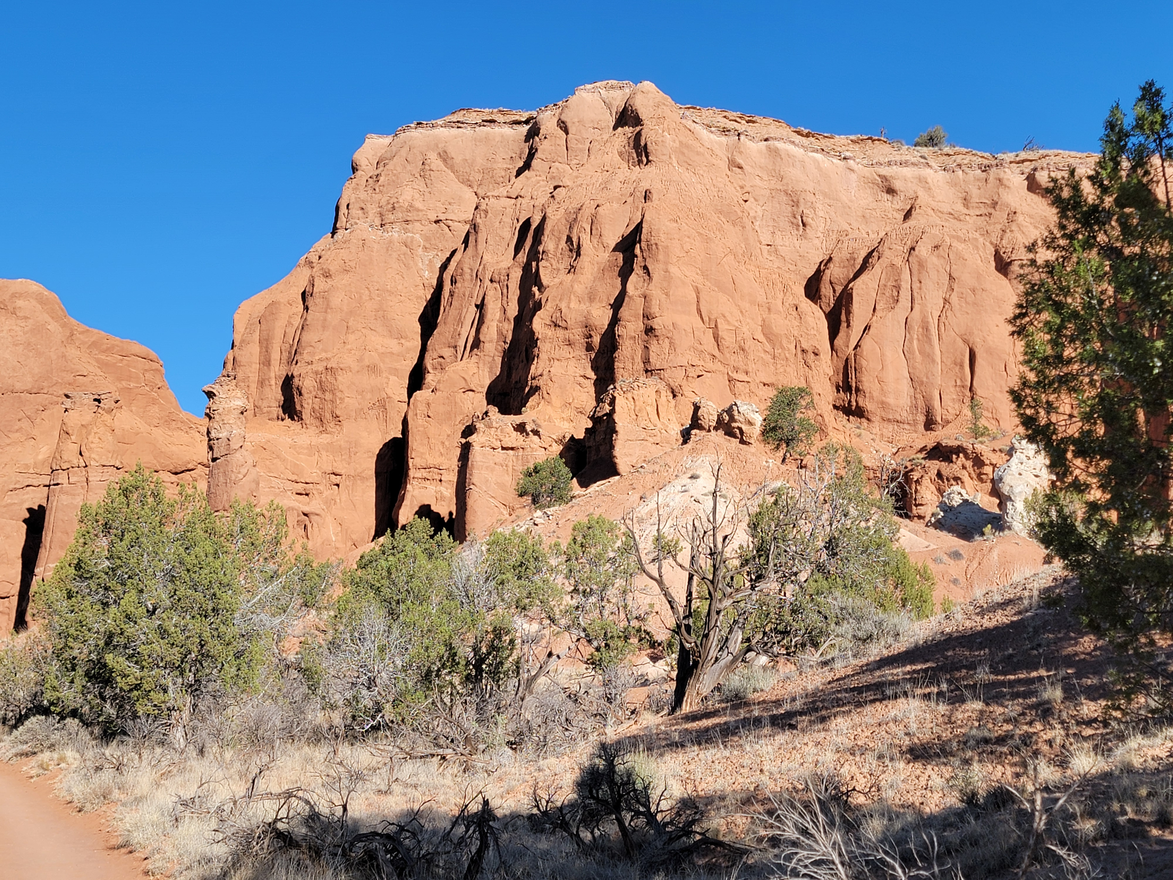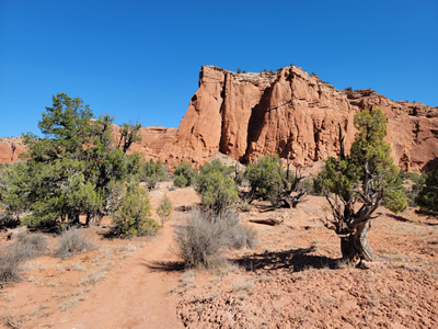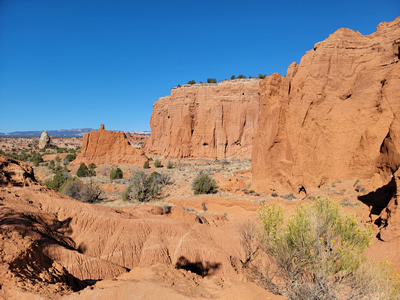 The trail stayed close to the escarpment that bounded Kodachrome Basin on the north. It wound in and out of alcoves and indentations in the cliffs. It passed close to several impressive, free-standing spires. There are about fifty of them in the park. And of course all of the rocks were bold, bright colors. The place is called Kodachrome Basin for a reason. There were lots of opportunities for photos, with the red rocks contrasting with the blue sky above and the green vegetation at the base of the cliffs.