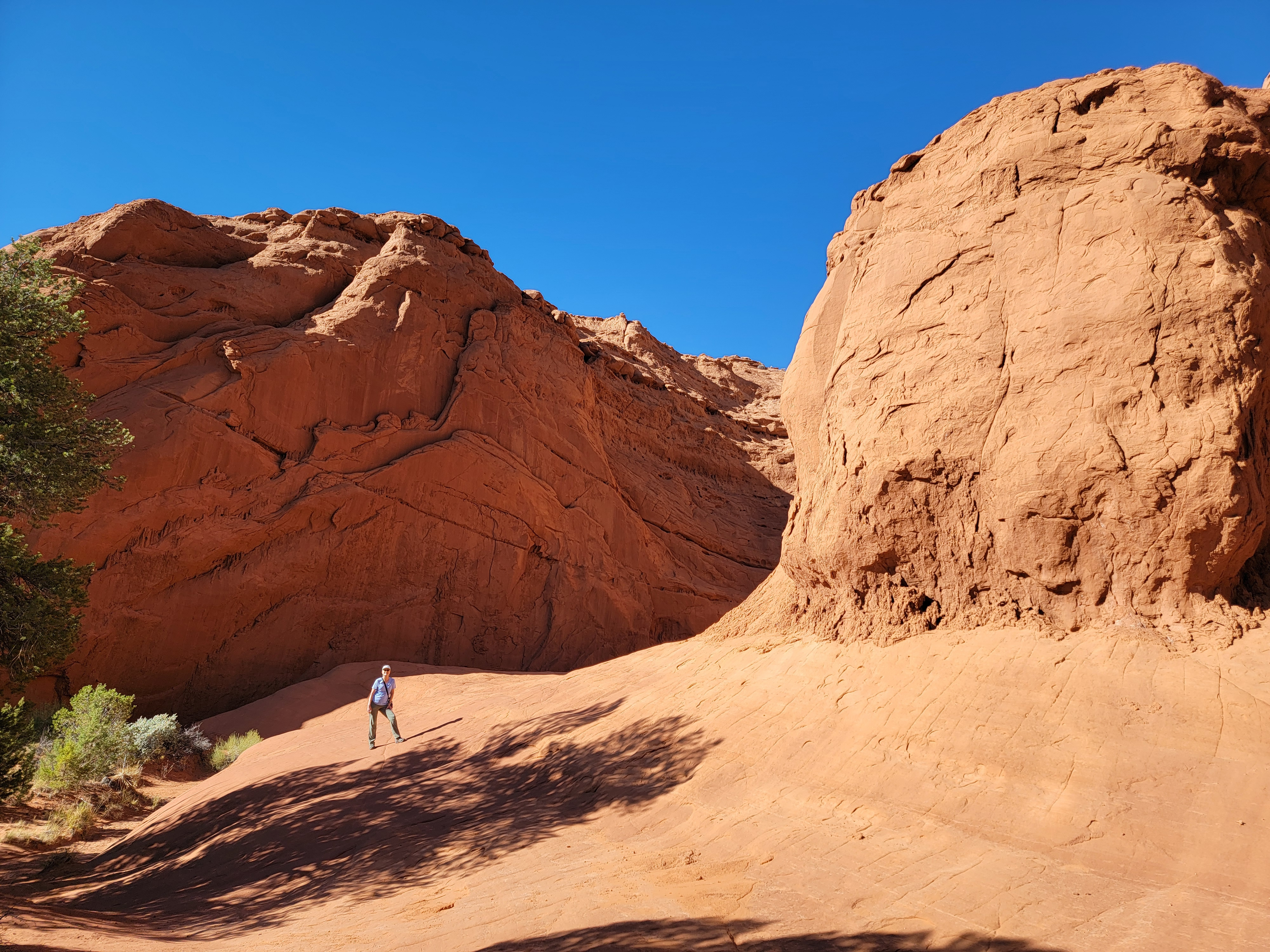 We took a spur trail to Secret Passage, which is a very short slot canyon. It was somewhat confusing because the area was crisscrossed with social trails where people had explored the nearby rock formations. For much of the way, the route crossed slick rock, just marked with cairns or the scuff marks of boots on the stone. When I paused to take photos in the slot canyon Sandy got ahead and went out of sight around a corner. I hurried to catch up but after a few minutes of hustling I still couldn't see her. Oh, oh. We must have gone different ways. I doubled back and started calling. I was just beginning to get nervous when we found each other about five minutes later. We resolved to make sure we stayed in sight of each other the rest of the way. We didn't want to have to hike back to the trailhead separately. Plus all the snacks were in my pack.