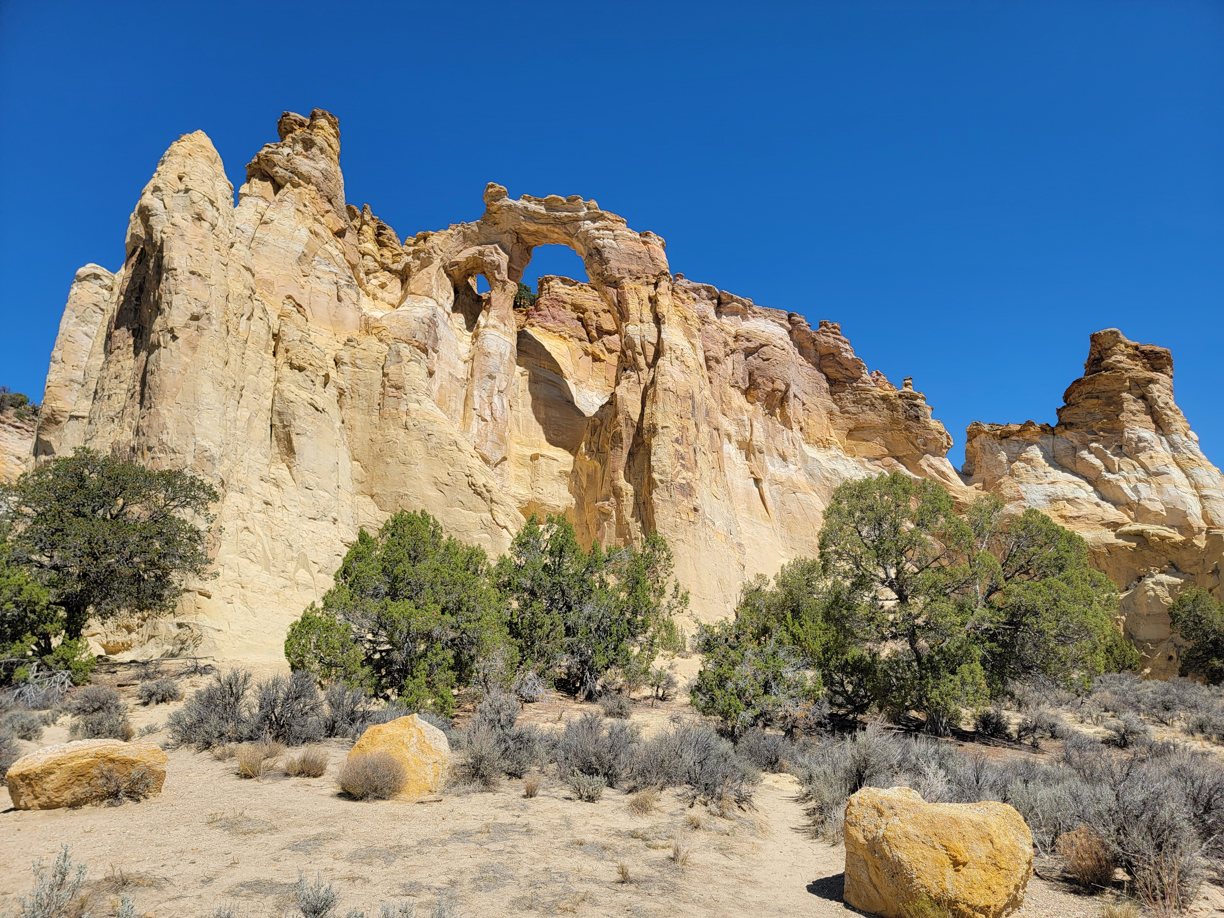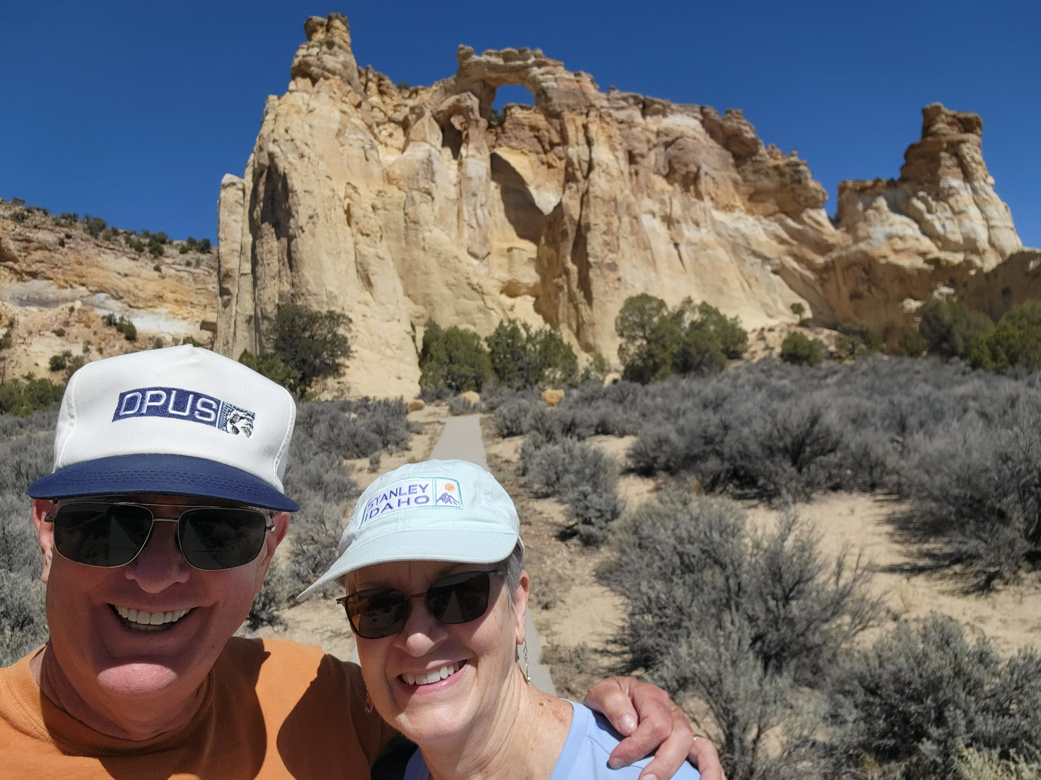Of course we stopped at the visitor center on the way out as planned. I got a tshirt. Sandy got a jacket. Both had Kodachrome Basin logos on them, of course. And we both got a drink and some ice cream to hold us till we could get lunch. Which we needed because we had one more stop that we wanted to make before heading back to civilization - Grosvenor Arch. From the turnoff to the park, it's about ten miles further down the rough dirt road heading away from town.
