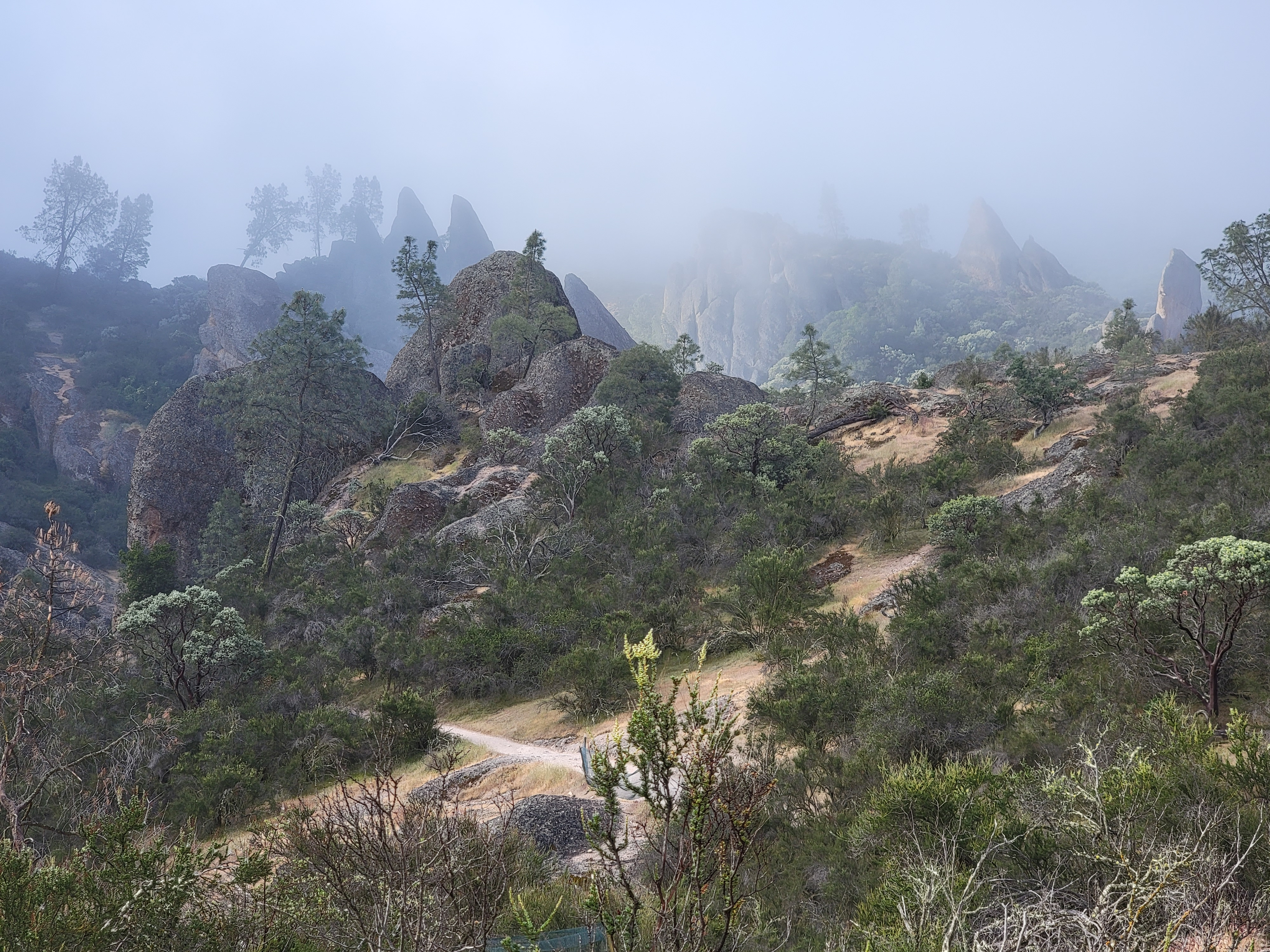 My usual weather website didn't have a forecast specificly for the national park. The best I could do was the forecast for Hollister. It said there would be clouds early but that they would clear later in the morning. That would be good enough if it held for the park as well. Sure enough, when I left early the next morning there was heavy fog. I wasn't too worried. I learned back in my grad school days in the Bay Area that fog in the early morning usually burned off before long in this part of California. I did get nervous when it started to drizzle as I drove to the park. Maybe this wasn't just ground fog.
