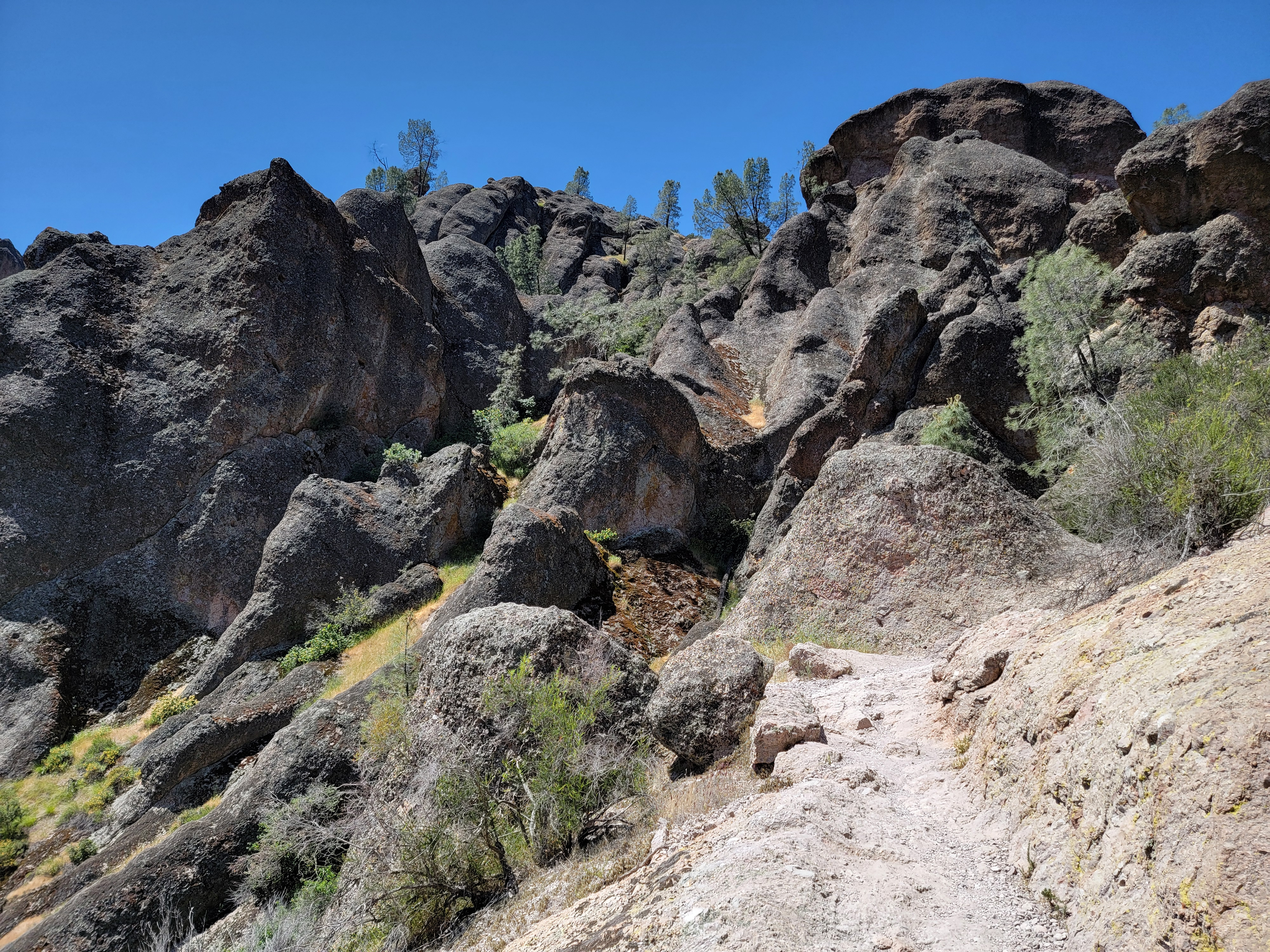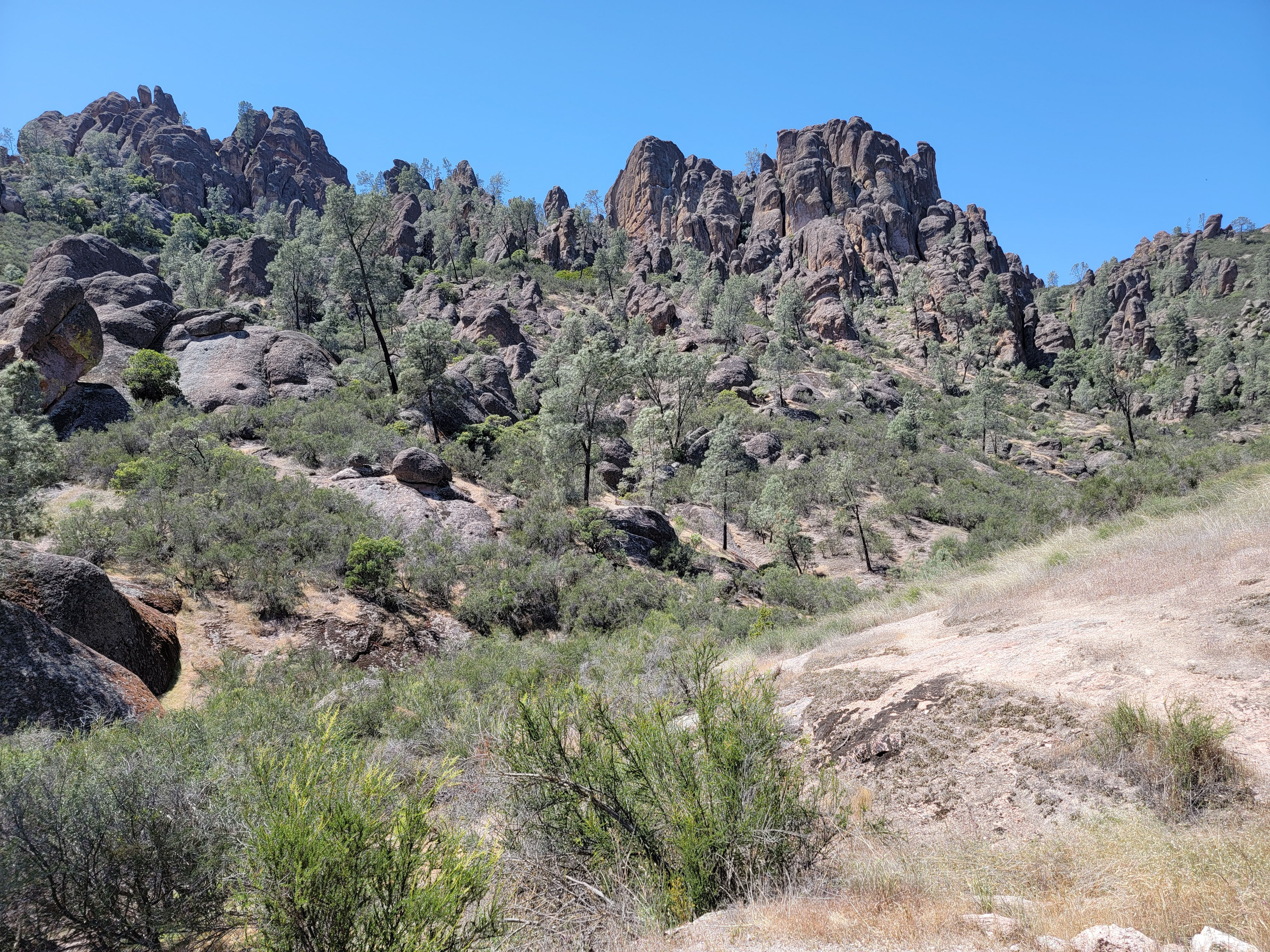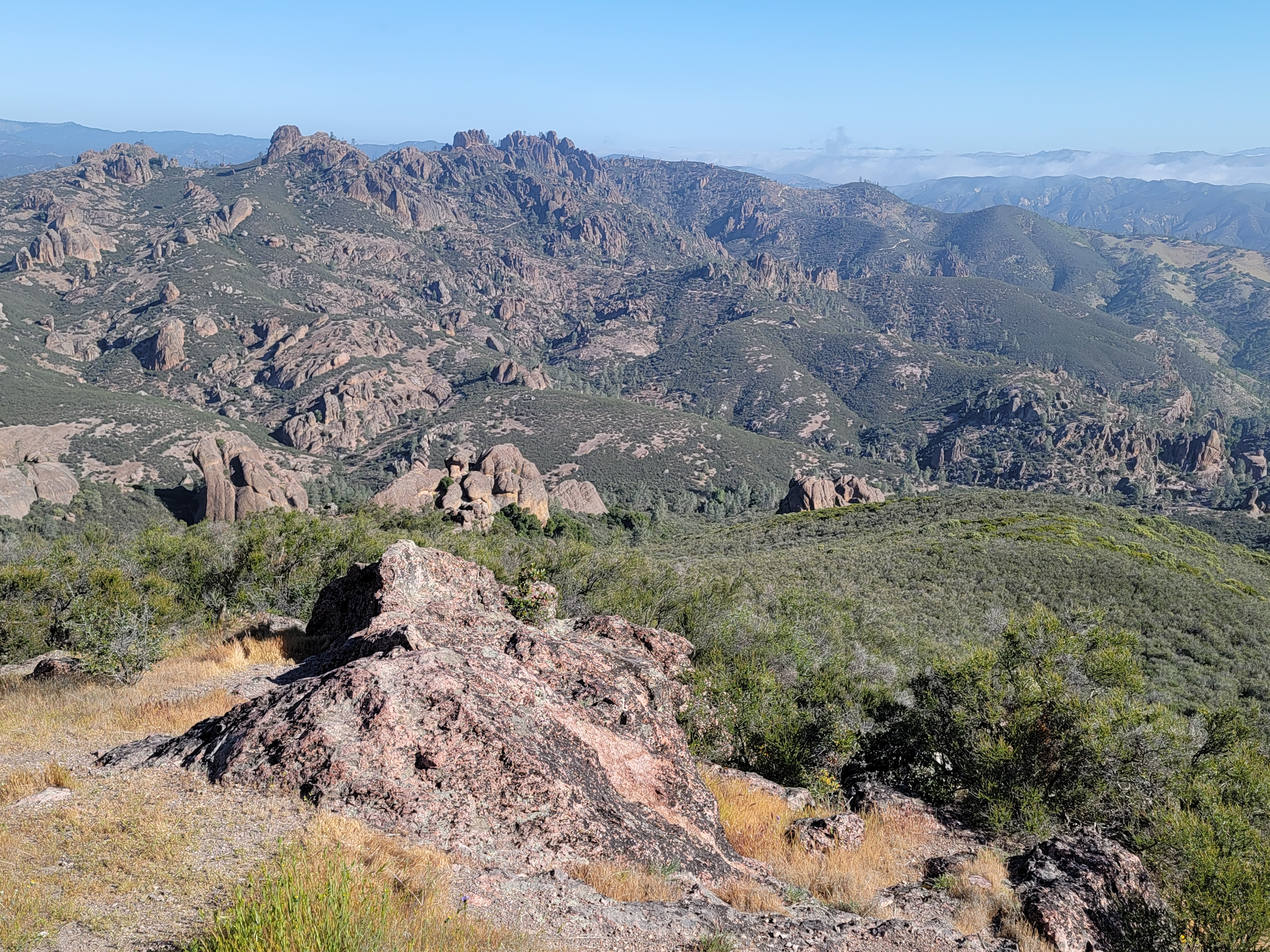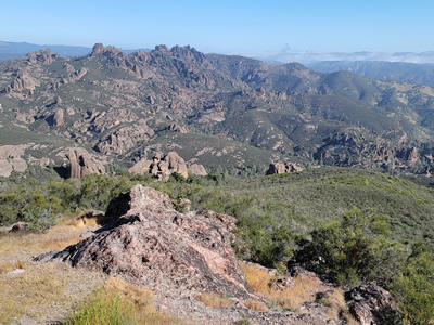 I had two main options for hikes. One was the High Peaks Trail. It's about a five mile loop with 1600 feet of elevation gain. It traverses the ridge to the north of the main park road, winding through many of the rock pinnacles that give the park its name. It features a little bit of scrambling and exposure to make it more interesting. The other option was the Chalone Peak Trail, about 7.5 miles and 2200 feet of elevation gain. It climbs to the summit of North Chalone Peak. At 3,304 feet it's the highest mountain in the park, and for quite some distance around. The one time I had come to the park before I was in my early twenties and had done both trails in a day. But I had been working hard all winter getting ready for my dive trips to Bonaire. I had lost quite a bit of weight and felt strong. I wanted to test myself. If I felt good, I thought I would try to do both trails again.