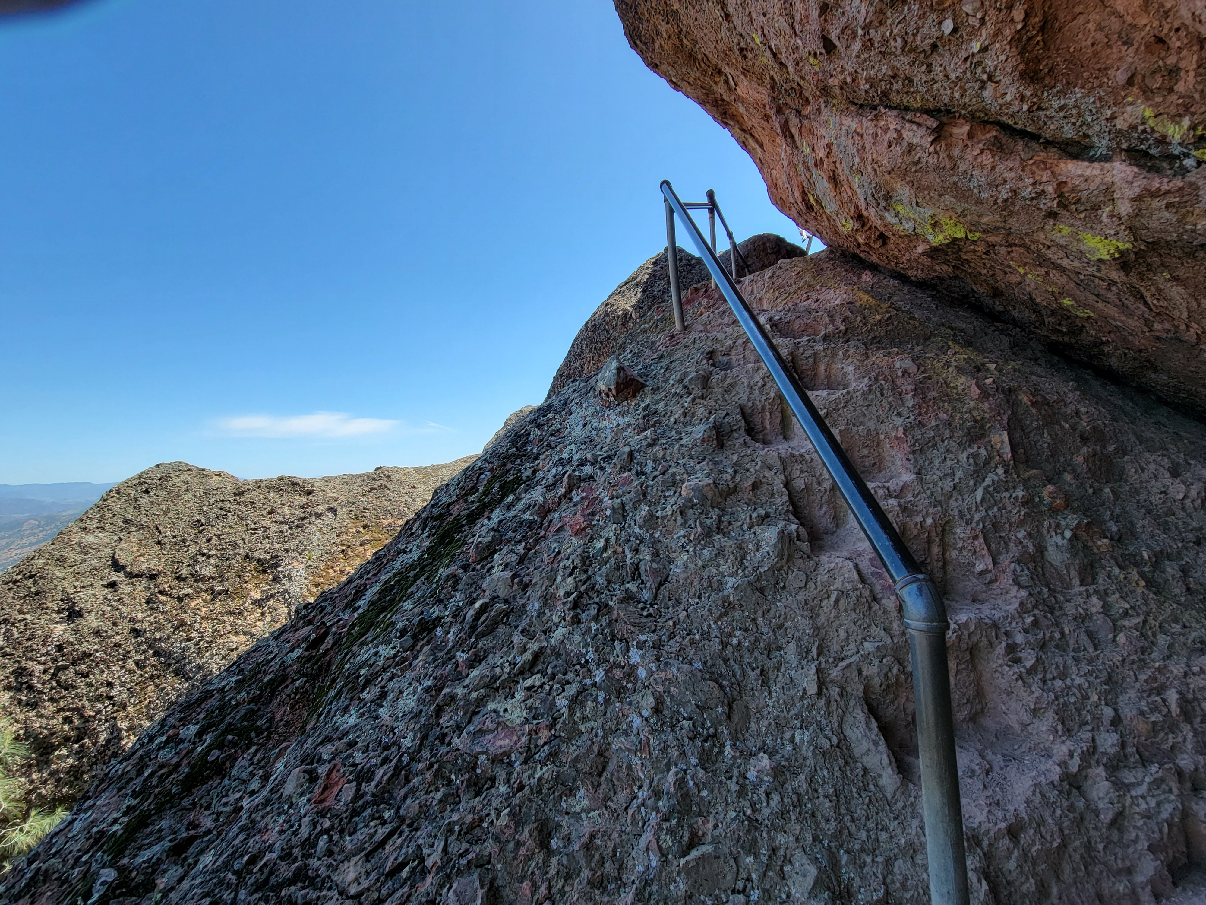 Of course, that meant that the trail went up instead of down. Gaining back elevation that you have just given up is always the hardest. I did spend a few minutes questioning my decision to do this second hike. But then I just decided to take it easy. It was a beautiful day. The scenery was great. I just took my time and climbed slowly. I had to do about another 1500 feet of elevation gain. After passing through a rock tunnel I reached the ridge crest. Here the elevation was roughly constant, and I do mean roughly because it was always going up and down. But the hiking was definitely interesting. There were many rock formations rising out of the ridge and the trail weaved in and out of them, up and down them. In places there were steps cut into the rock, and handrails where there were steep dropoffs. Definitely lots of fun.
