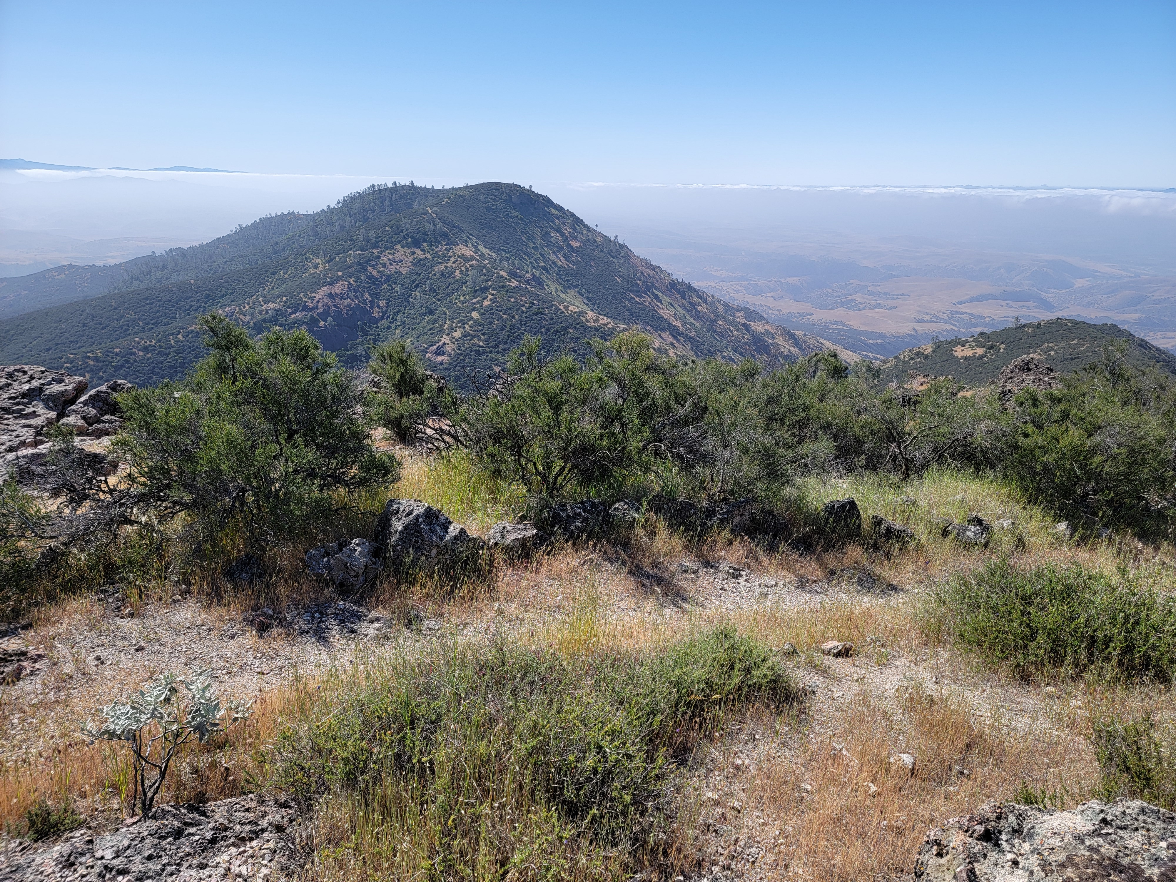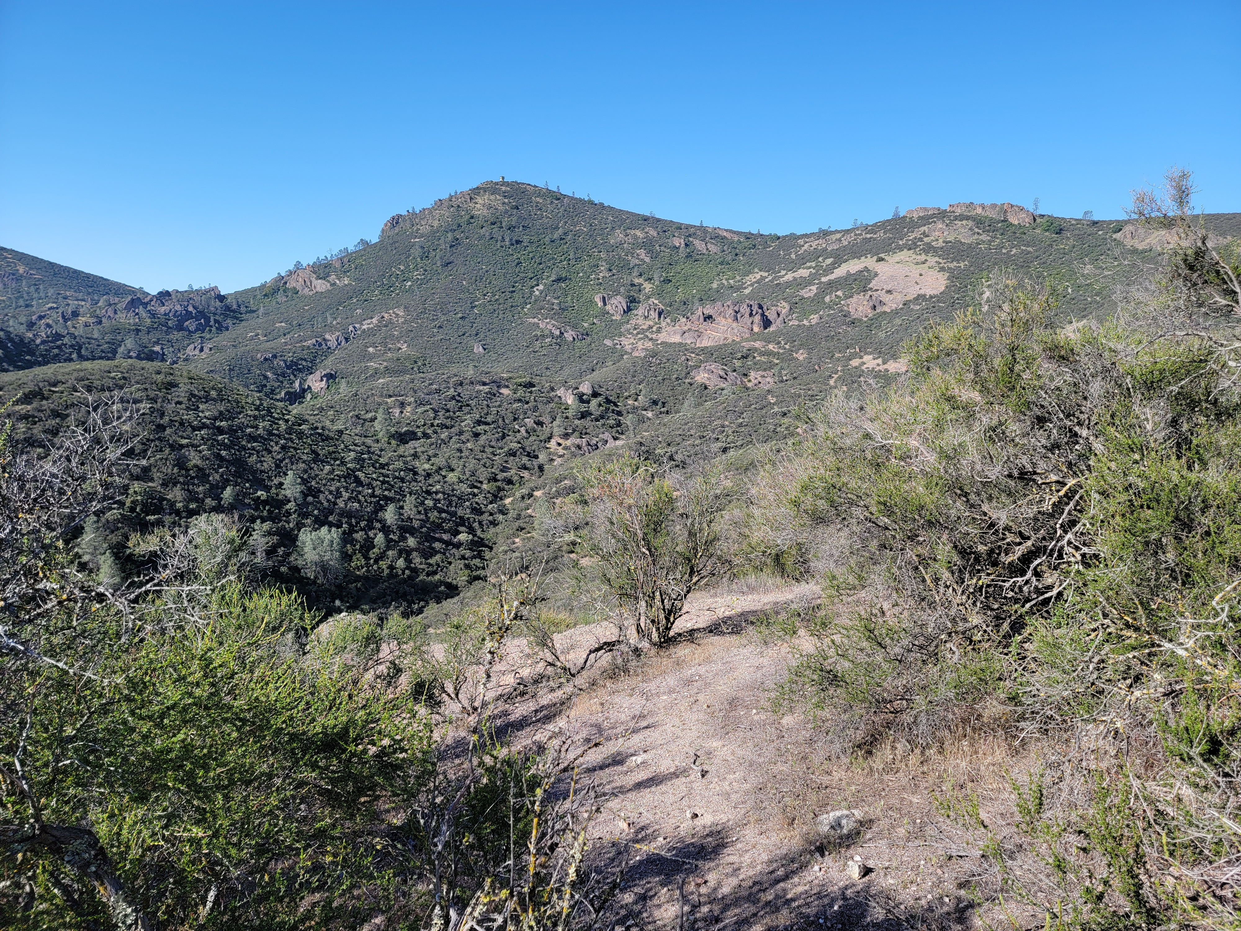 As the valley opened up the trail turned upward and climbed onto a ridge. Now I could see North Chalone Peak. It looked like it was still pretty far away and a lot higher than I was. I just kept plugging along. Eventually I reached the summit. There was an old lookout tower on top. That made sense because it was the highest point around for a long way in any direction. The veiw was exceptional. To the north I could see the High Peaks route, with most of the rock pinnacles that give the park it's name. To the south a ridge continued to Middle Chalone Peak and then further to South Chalone Peak. I had read of an unmaintained trail/hiker's track that continued all the way to South Chalone. I could see parts of it from from where I was. It was tempting to try to bag all three peaks but I decided not to. I still wanted to try to do the High Peaks Trail and the hike to just this summit would usually be enough for a good days work. I started back down.