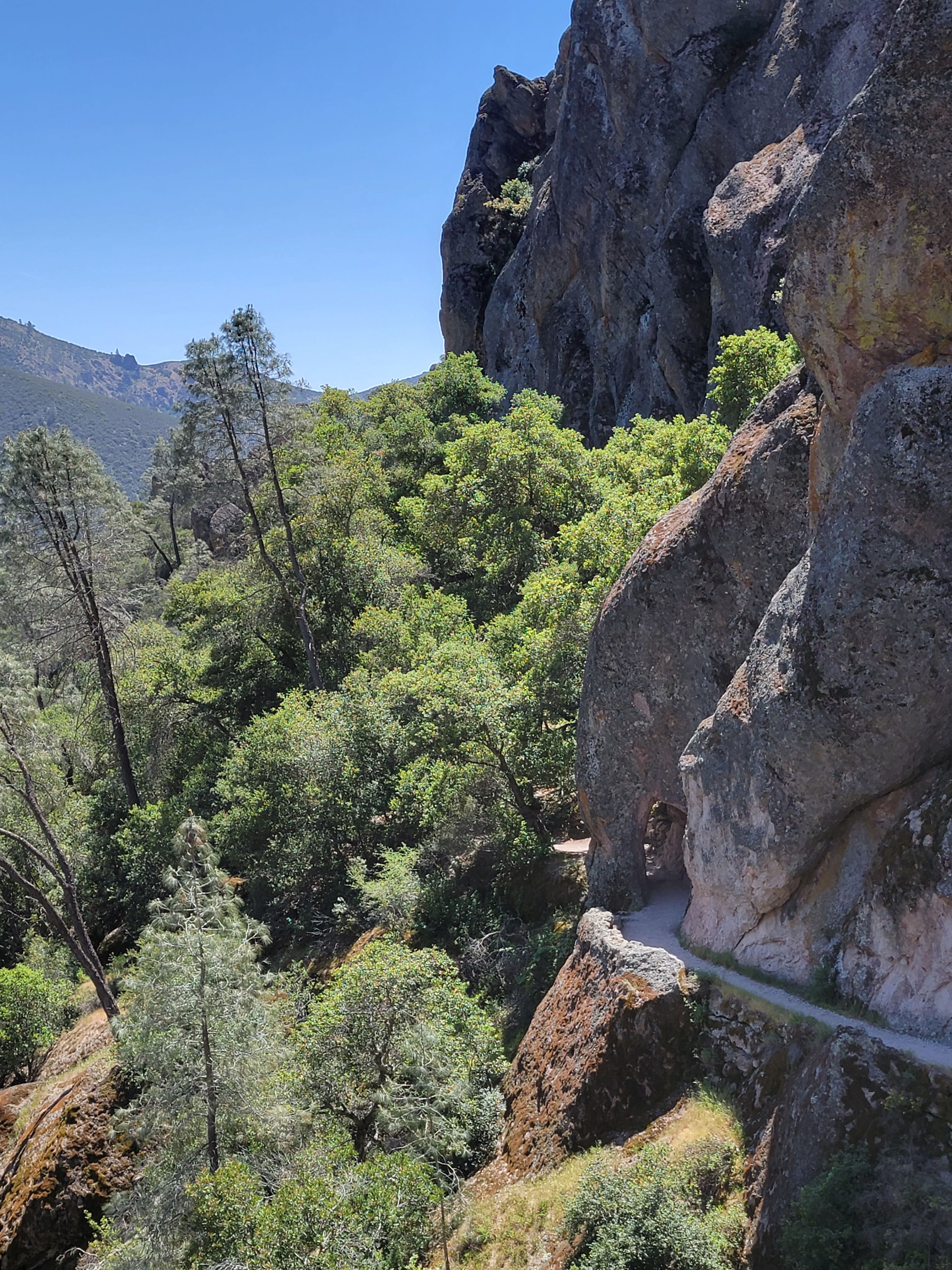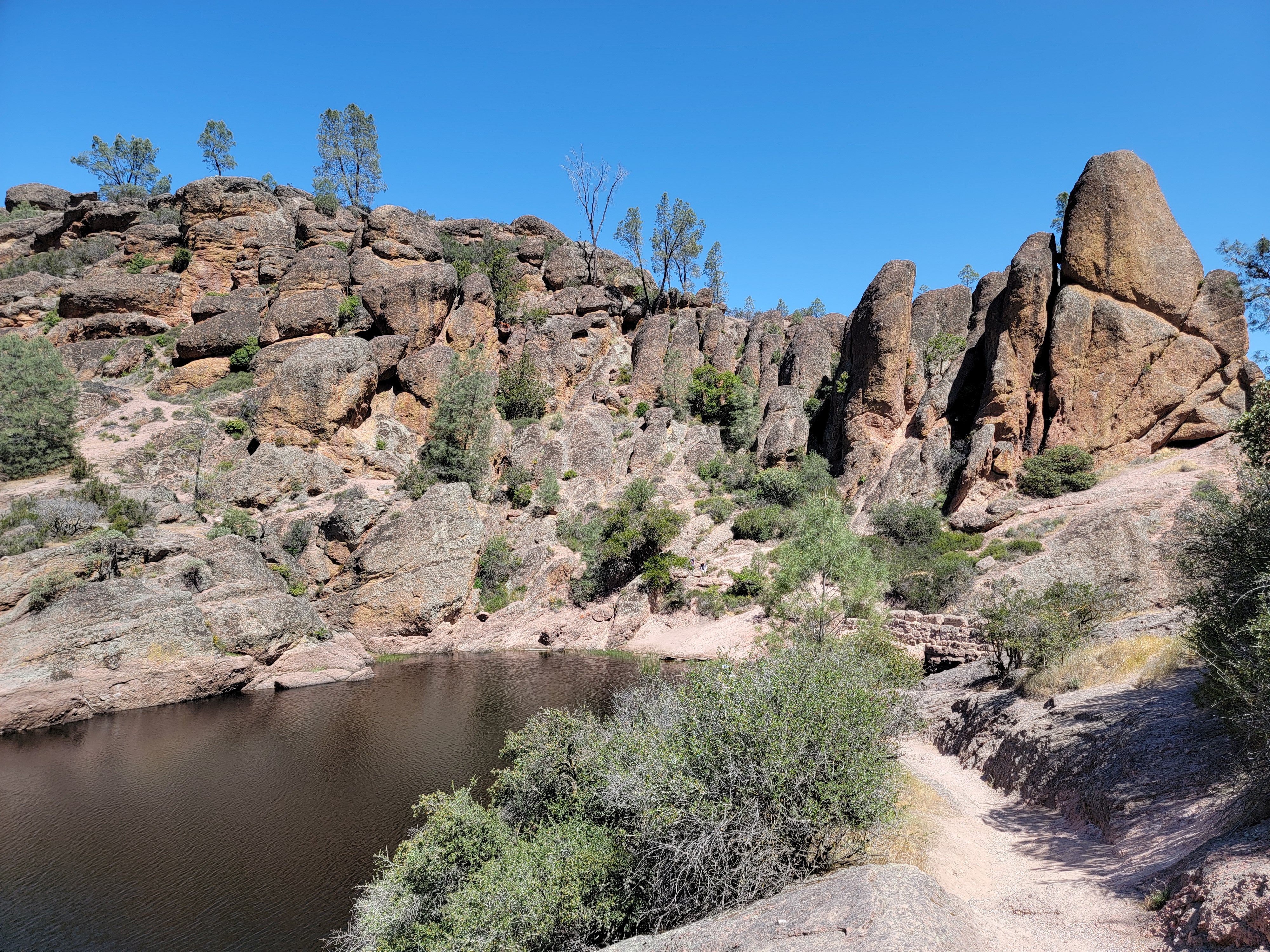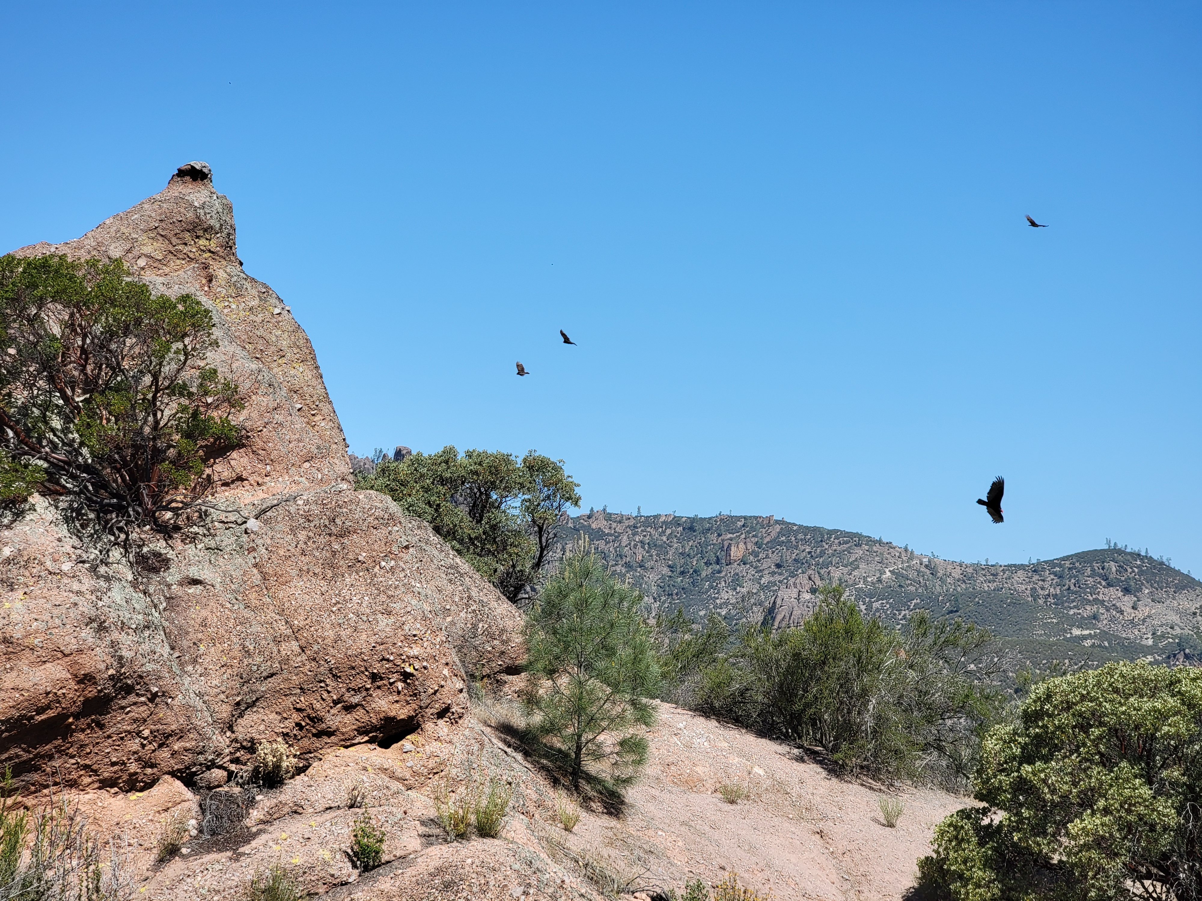 Further down, when I entered the valley again, there were multiple condors flying overhead. The California Condor nearly went extinct a few years ago. The total population was down to only twenty two individuals. These were captured and bred, and then released back into the wild. Today there are estimated to be about 300 birds in California, with 70-90 of them in and around Pinnacles National Park. It seemed to me that most of them were flying right overhead where I was hiking. Very cool.