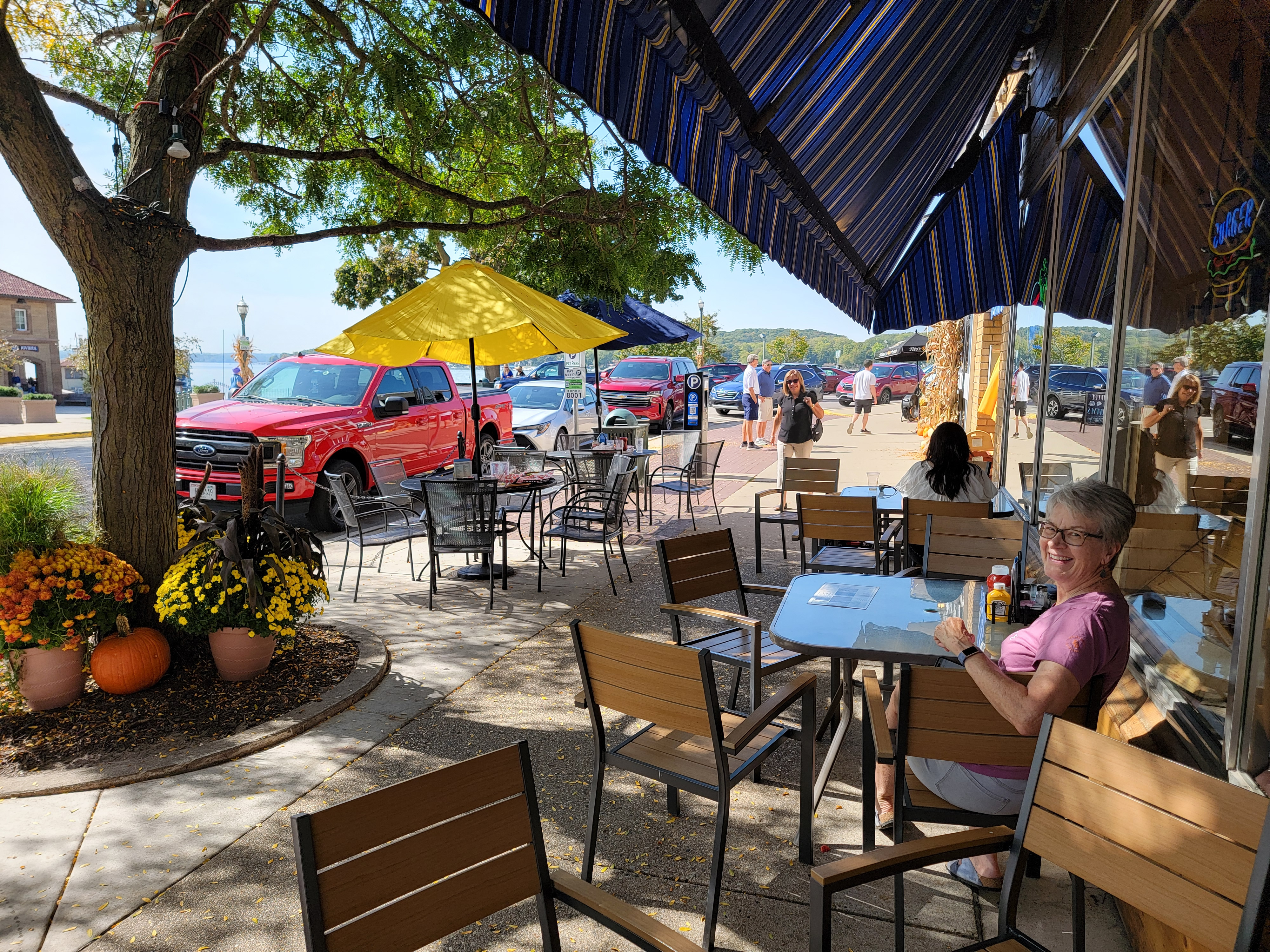 Thursday was their day to go to daycare so Sandy and I left that morning and drove up to Wisconsin. We always pass through the very edge of Lake Geneva when we travel between Yorkville and Milwaukee. There's a WalMart there that is my standard midpoint-of-the-trip stop for snacks. They carry my favorite pretzels - thin and extra salty. They're probably not the best for my health, but boy do they taste good. This time we turned and went into the town of Lake Geneva. After finding a parking spot (not easy), we spent a few hours walking through the downtown area, checking out the shops. We had dinner at Speedo's Harborside Pub & Grill. It was just across the street from a small park on the lakeshore. We sat out on their patio enjoying the view of the lake on a beautiful afternoon.