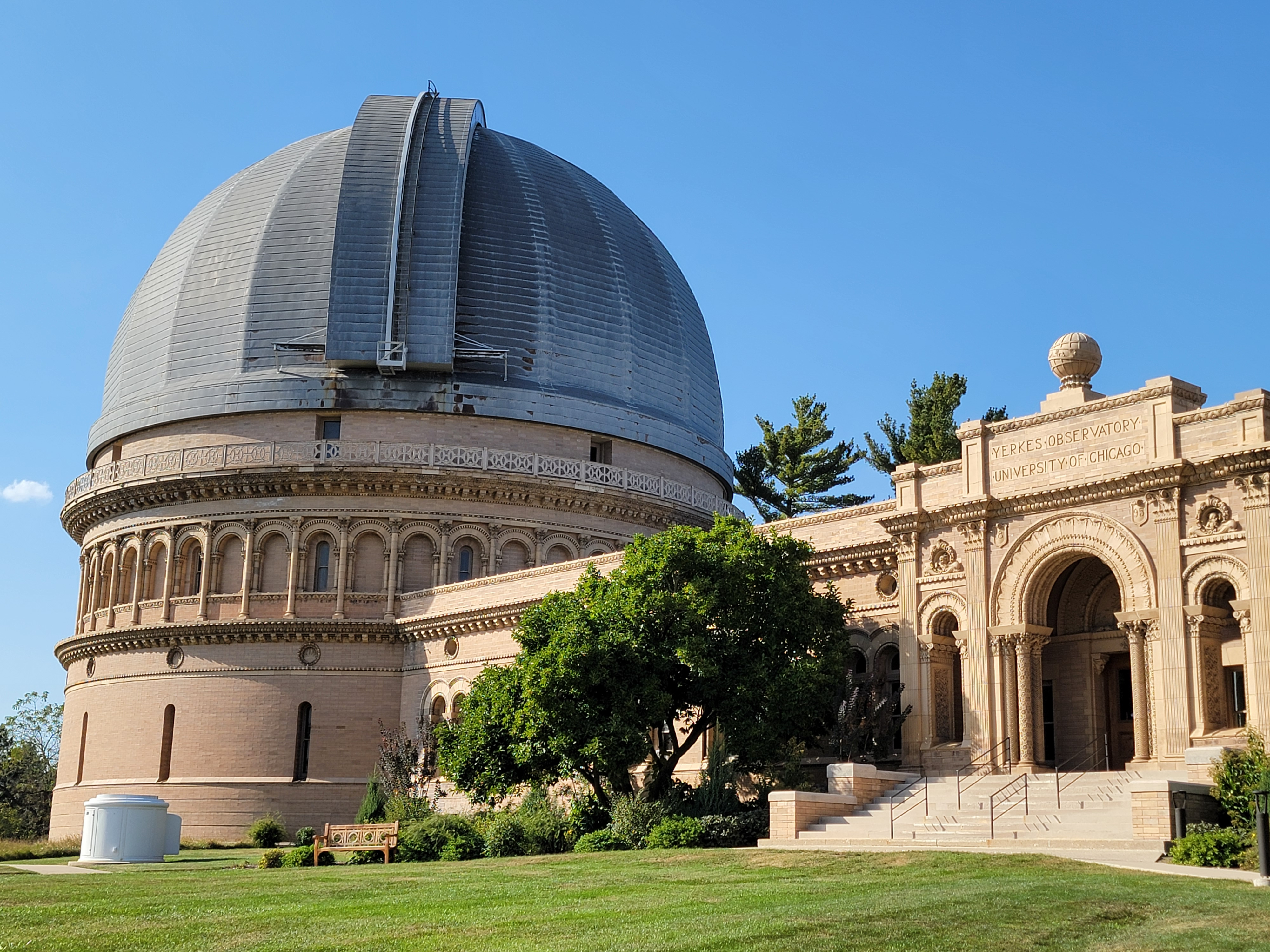 After eating we drove around the lake to Williams Bay. Just outside of town is Yerkes Observatory. It was operated by the University of Chicago from 1897 to 2018. It was famous for its 40 inch telescope, the largest refracting telescope ever used for general astronomical research. When I was little, my dad used to read books about astronomy to me. I remember seeing pictures of Yerkes Observatory and its telescope in those books. Yeah, I was a nerdy little kid. Technology has since passed the observatory by. Refracting telescopes had a fundamental limitation. Since the light traveled through the lens, it could only be supported around the edges. That placed a limit on how big the lens could be without introducing distortions. Reflecting designs passed up refractors a long time ago for state of the art research in astronomy. But I used to have a 3 inch refractor when I was a kid. I used it to look at craters on the moon and to plot the position of Jupiter's Galilean satellites for a school science project.