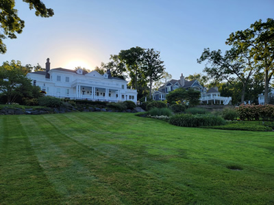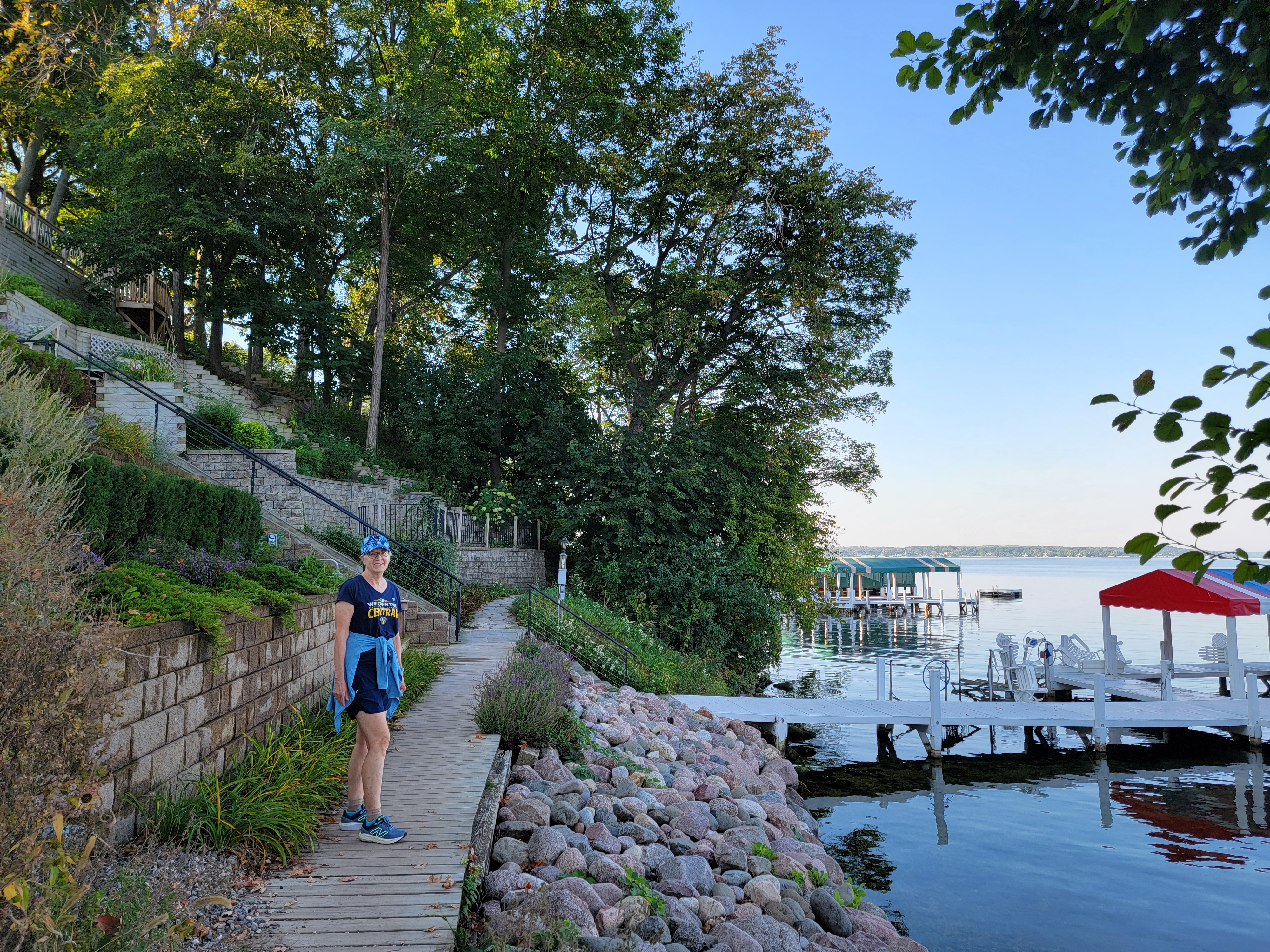 Next morning we were up early and went for a hike. There is a public trail along the shore of Lake Geneva. It's over twenty miles long if you go all the way around the lake. While I think it would be fun to do, that's a little more than we were looking for this morning. It was a beautiful day and the scenery along the lake was pretty. The houses were impressive too. Lake Geneva was the fashionable spot to build a summer home if you were rich in Milwaukee or Chicago in the late nineteenth and early twentieth centuries. There were some amazing, large, beautiful houses along the shore of the lake.