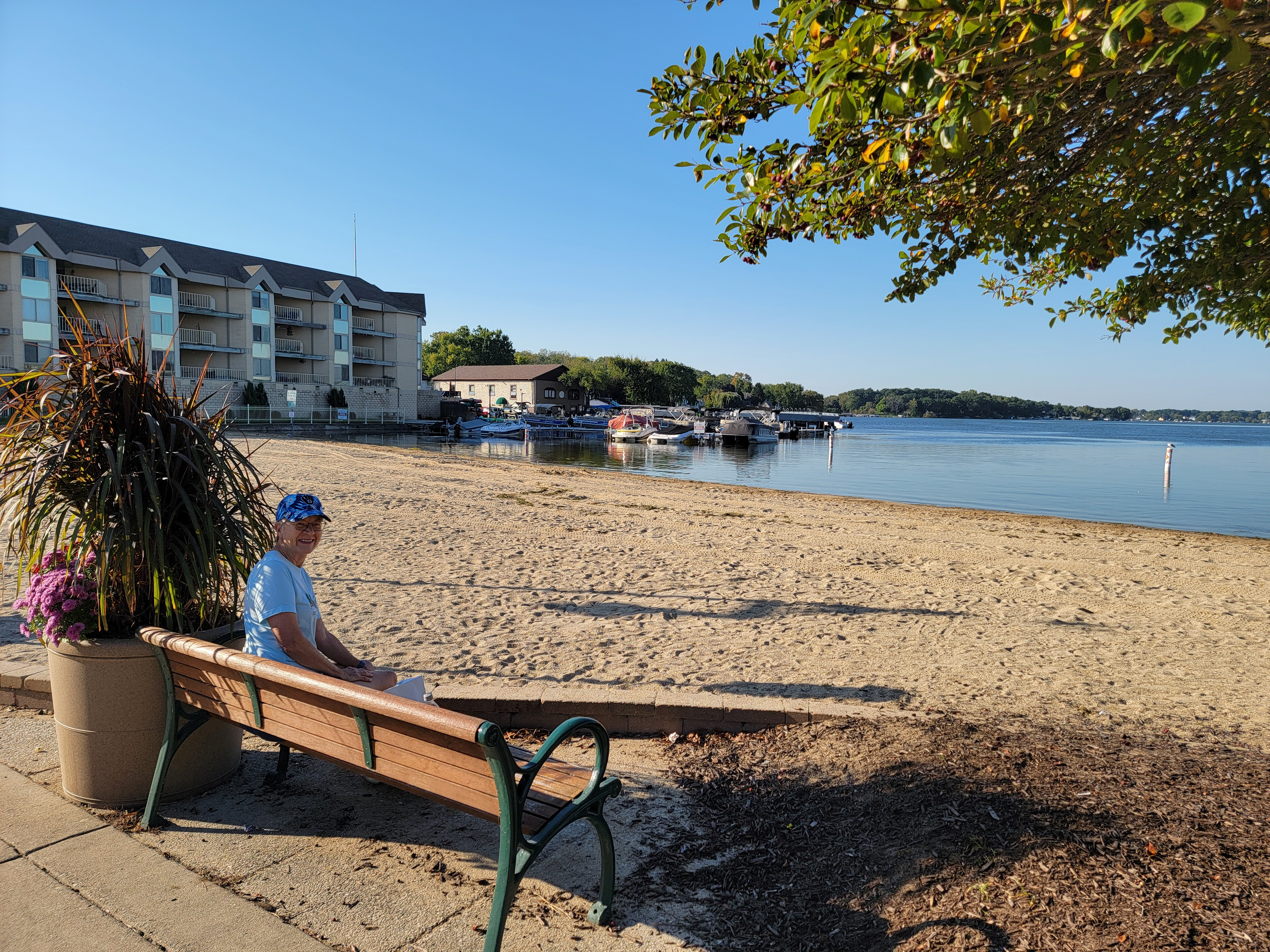 Saturday was the Big Day, but the wedding wasn't until late in the afternoon. We had a lot of free time beforehand. We started by taking a short drive to the village of Pewaukee where we went to the Beach Bum Bakery. It's just across the street from a beach on Pewaukee Lake. You have to admit that it's got a pretty cool name. We got some doughnuts and sat out on a bench looking over the lake while we ate our breakfast. It was another beautiful morning.