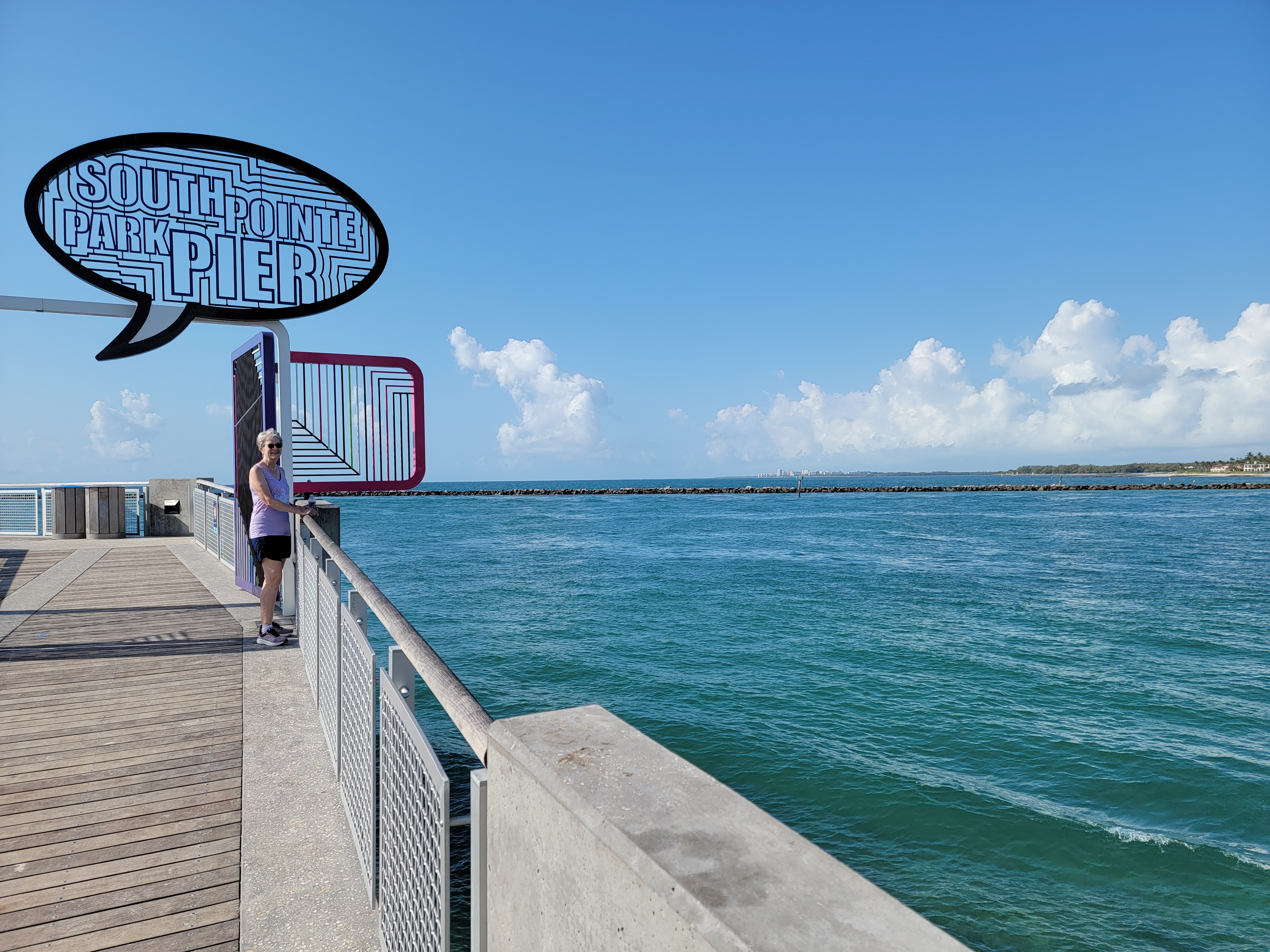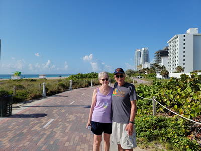 Sandy and I took an early morning walk on the path along the beach. We heard "Good morning" from behind us. It was Tim, out for his morning run. He did stop long enough to take some pictures of us before continuing. Sandy and I can walk a long way, but our running days are behind us. And we did walk a long way. We went all the way to South Pointe Pier and walked to the end of it. We went by Smith & Wollensky, where we had the event the evening before, and finally Monty's and the dive boat dock in the marina before heading back.