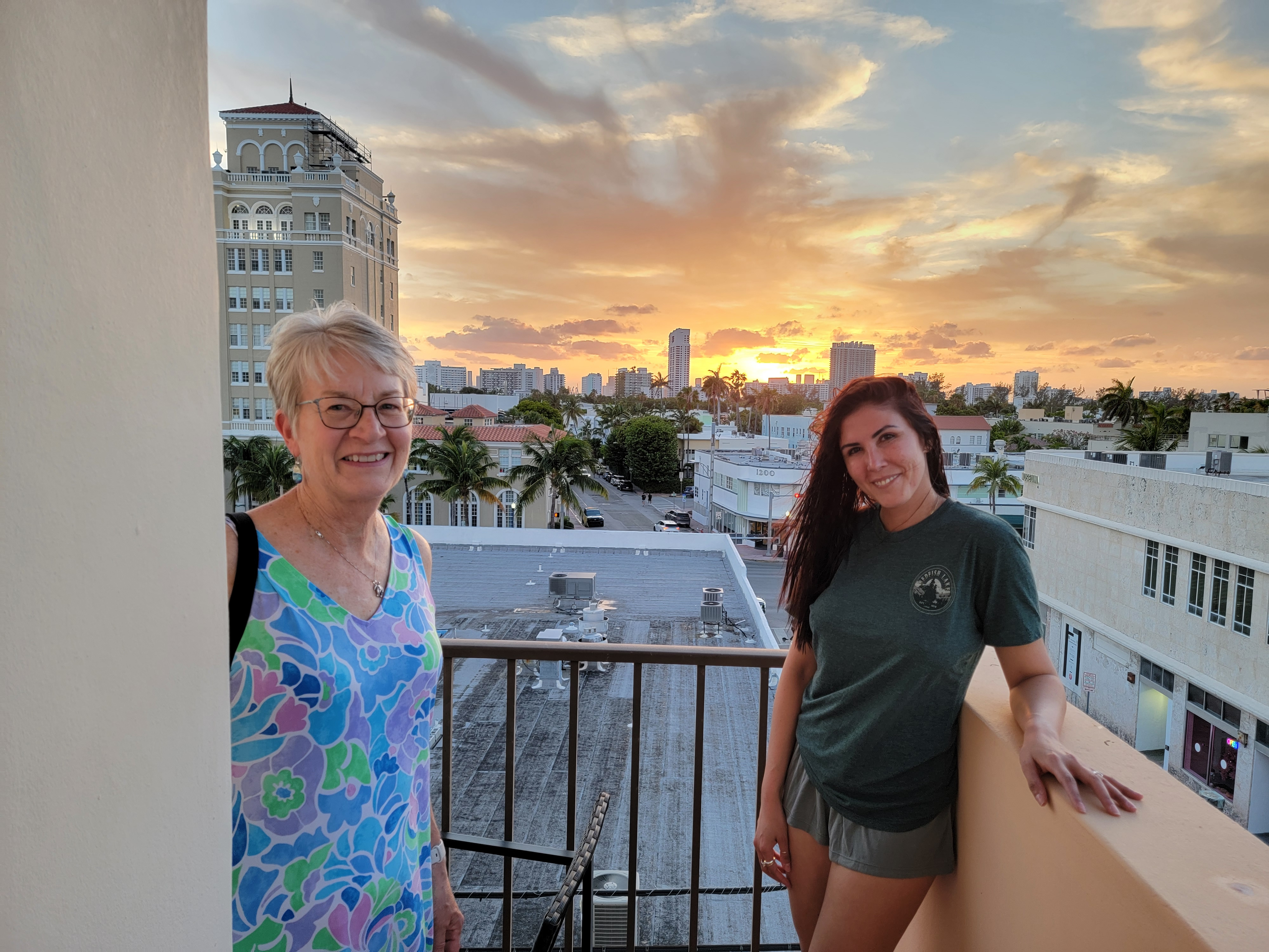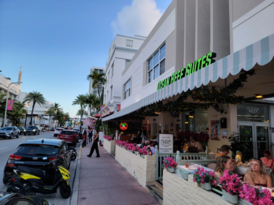 We decided to make it an extended weekend to give us extra time in Miami Beach. We flew out on a Thursday. It's a long way to go, and traveling east against the time change, we didn't get there until early evening. Sandy and I had dinner at Il Pastaiolo. It claims to be the best Italian restaurant in Miami Beach. I don't know about that. There are a lot of Italian restaurants in Miami Beach. It was very good though. It was on the ground floor of the Ocean Suites, with seating outside on a patio right alongside the sidewalk on Collins Avenue. The location couldn't be more convenient, and it was a fantastic spot for people watching. In fact, just as we were finishing, two very interesting people walked by, Tim and Yanet on their way home. They hadn't been able to join us for dinner as they had a lot of prep to do, but they did invite us over to see their place. The location is amazing, only a block from Ocean Drive and the beach. In the back, they had quite a sunset view from their patio.
