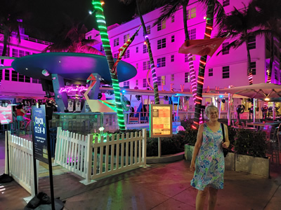 After visiting Tim and Yanet's place, we went for a walk. Sandy is usually not a night person, but since we were still on Mountain Time, it seemed early for us. South Beach is busy during the day but it really comes alive at night. There were lots of people everywhere, so we felt safe walking around at night. We scouted out the area. We found the closest minimart, so I could get Diet Cokes for the fridge in our room. We walked toward the beach and then along Ocean Drive. The street was lined with hotels, restaurants and bars. Everything was lit up. We checked out the tshirt shops, and there were quite a few good ones. They were open late too. I was going to have some tough decisions to make about which ones to get. There were people everywhere. Miami Beach is definitely a party place. Most importantly, I found The Baked Bear which made ice cream cookie sandwhiches. We had to stop there for dessert. They were awesome. I will confess that I went back there every night while we were in South Beach, no matter how late it was.