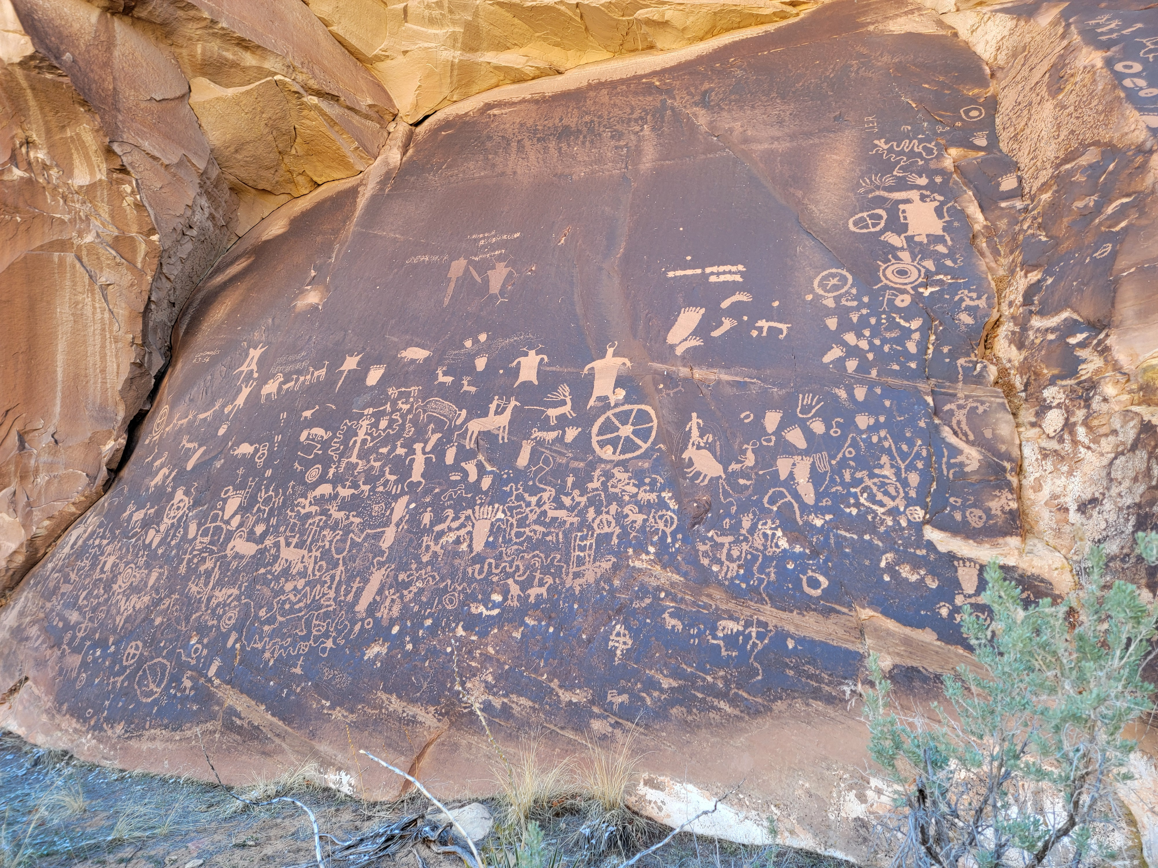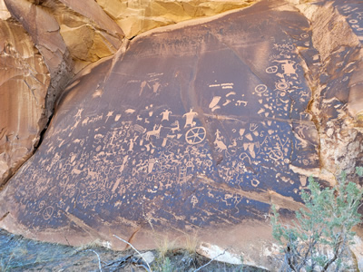 The next morning the sky was completely blue. So much for that worry. And while it was cold, there was no wind at all. I still waited around for a while before leaving for the park to give it a little time to warm up. Even though Monticello is the closest town to the Needles District, it still takes almost an hour to drive to the trailheads. Along the way, I made a brief stop at Newspaper Rock, a petroglyph site right next to the road. It was very impressive, although for me the most striking thing about it was that several modern people had scratched their names on the panel. It's hard to imagine how anyone could think that was a good idea.