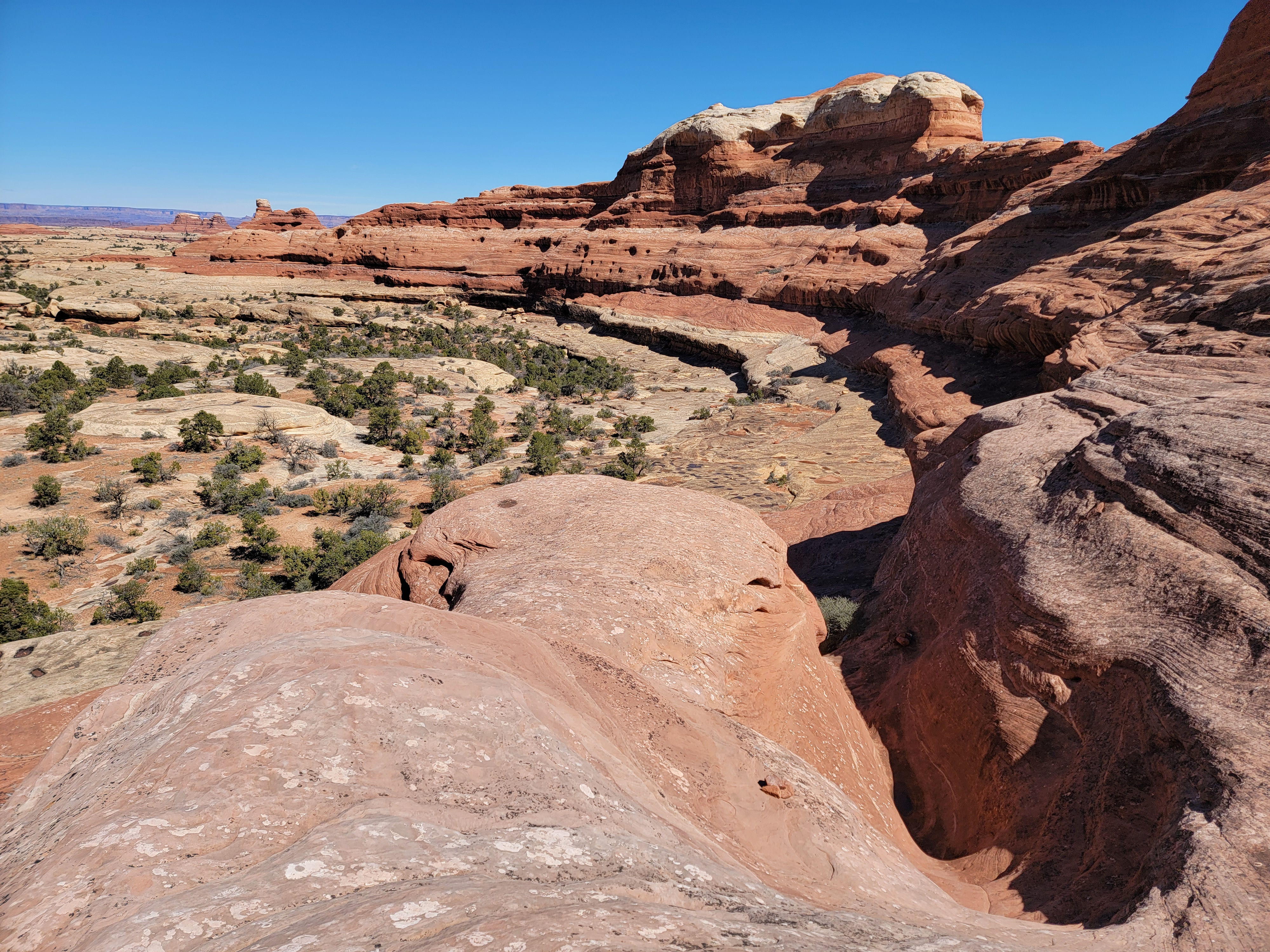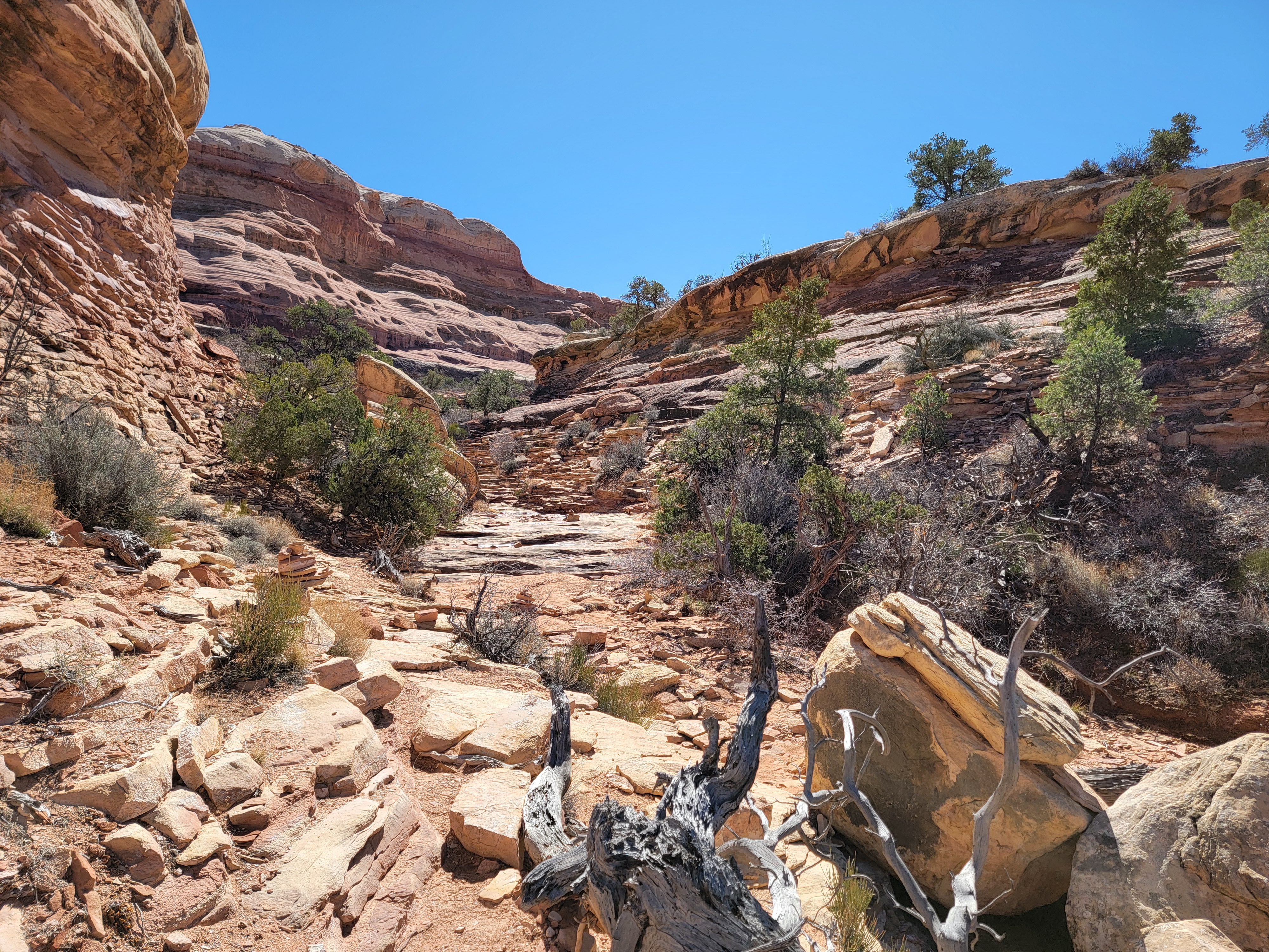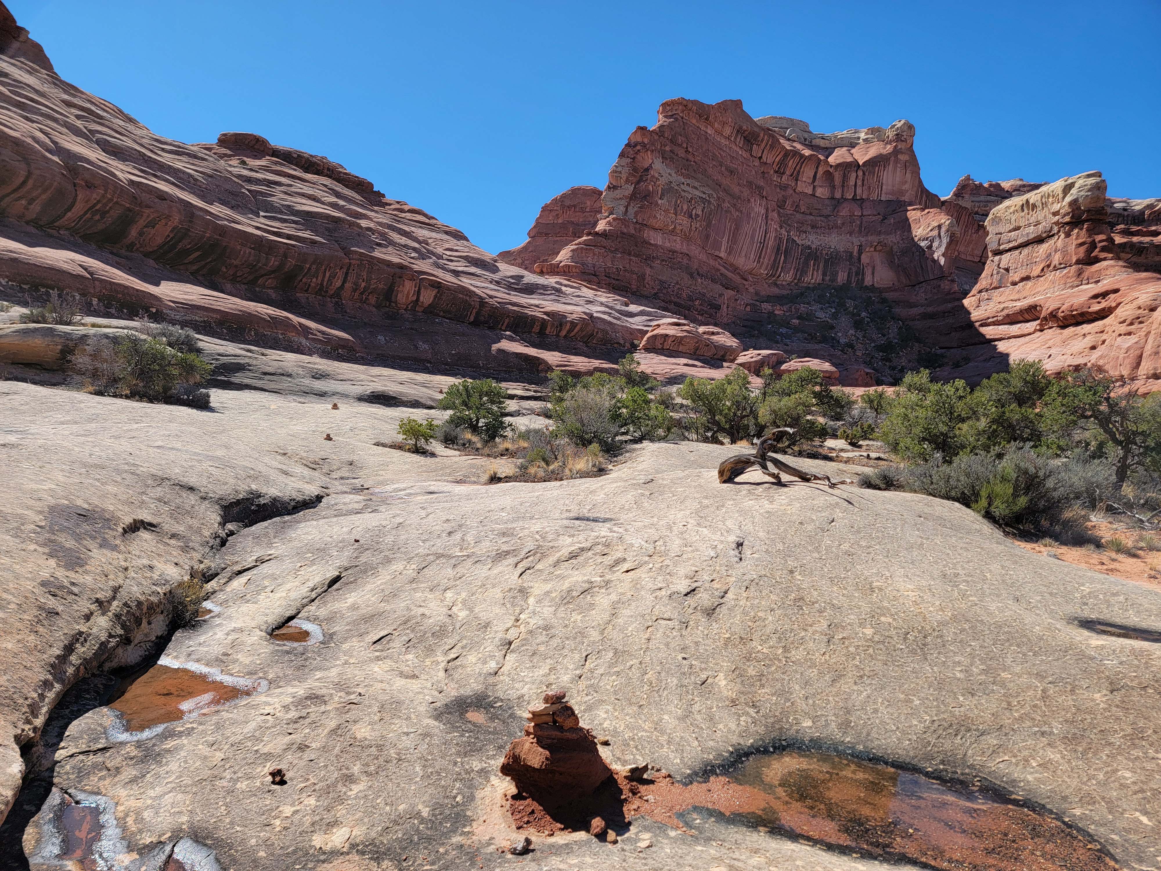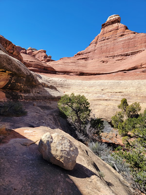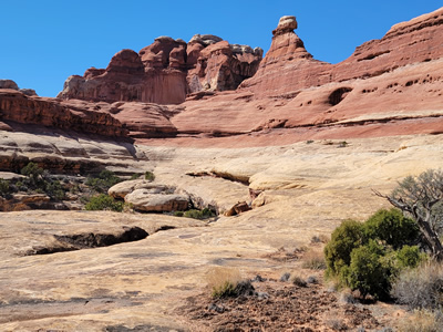 The trail starts by going up Big Spring Canyon, which is pretty but not spectacular. The fun starts as you near the head of the canyon. It's a dead end with sheer cliffs everywhere. It looks hopeless but the cairns marking the route over slickrock keep on going. Finally they led behind a rock that jutted out from the canyon wall. Behind the rock was a steep ramp, invisible from below, that led up the steep rock face. There was one rock step that was about waist high that was undercut. In my youth I probably could have gotten a leg up and stepped up on it. Between old age and a knee replacement that wasn't going to work. It took me two tries but I managed to get up. I would say that I did a mantle, a difficult technical climbing maneuver. Someone watching would say that I did a combination lunge and belly flop. Whatever you call it, it worked.