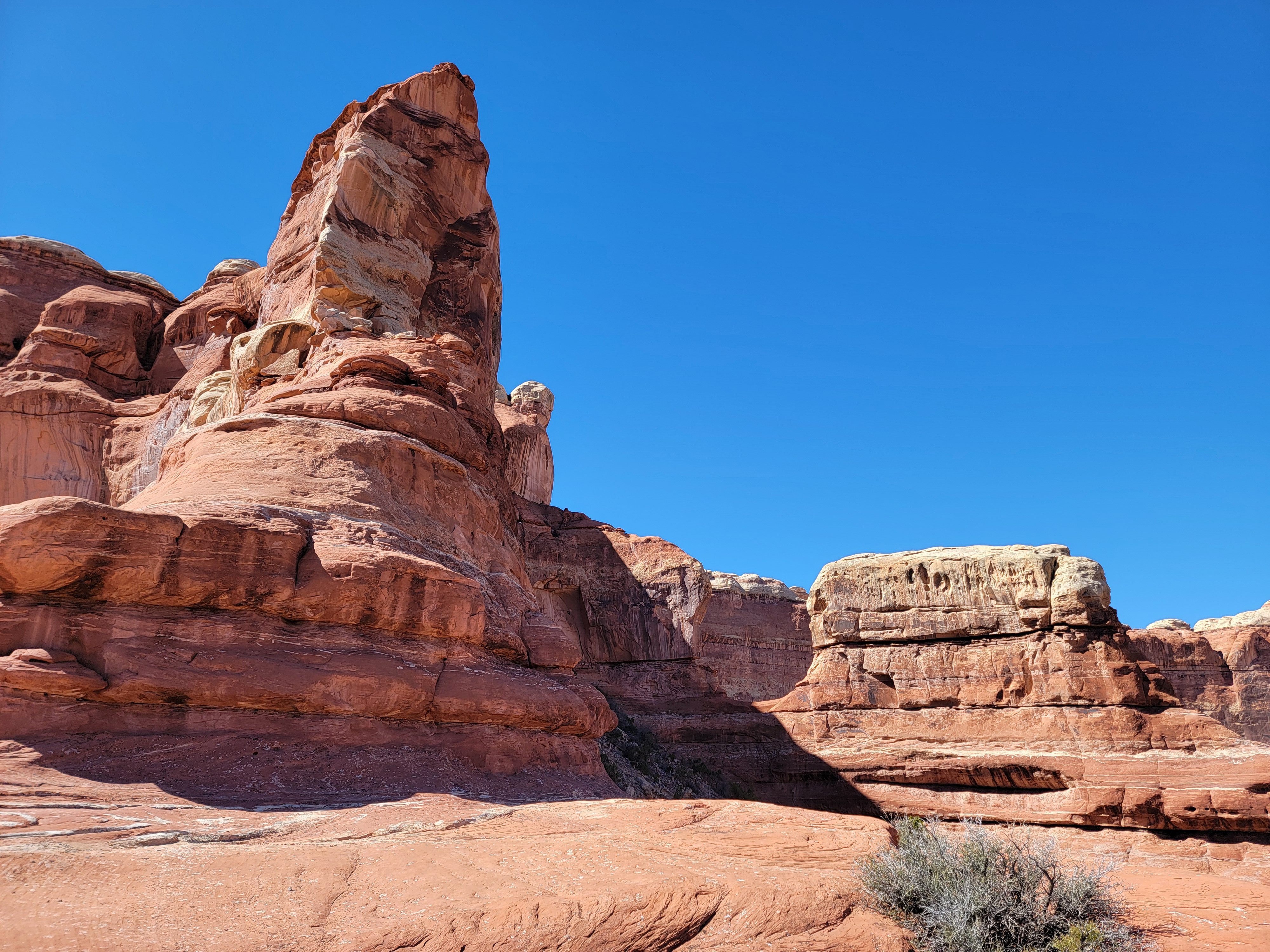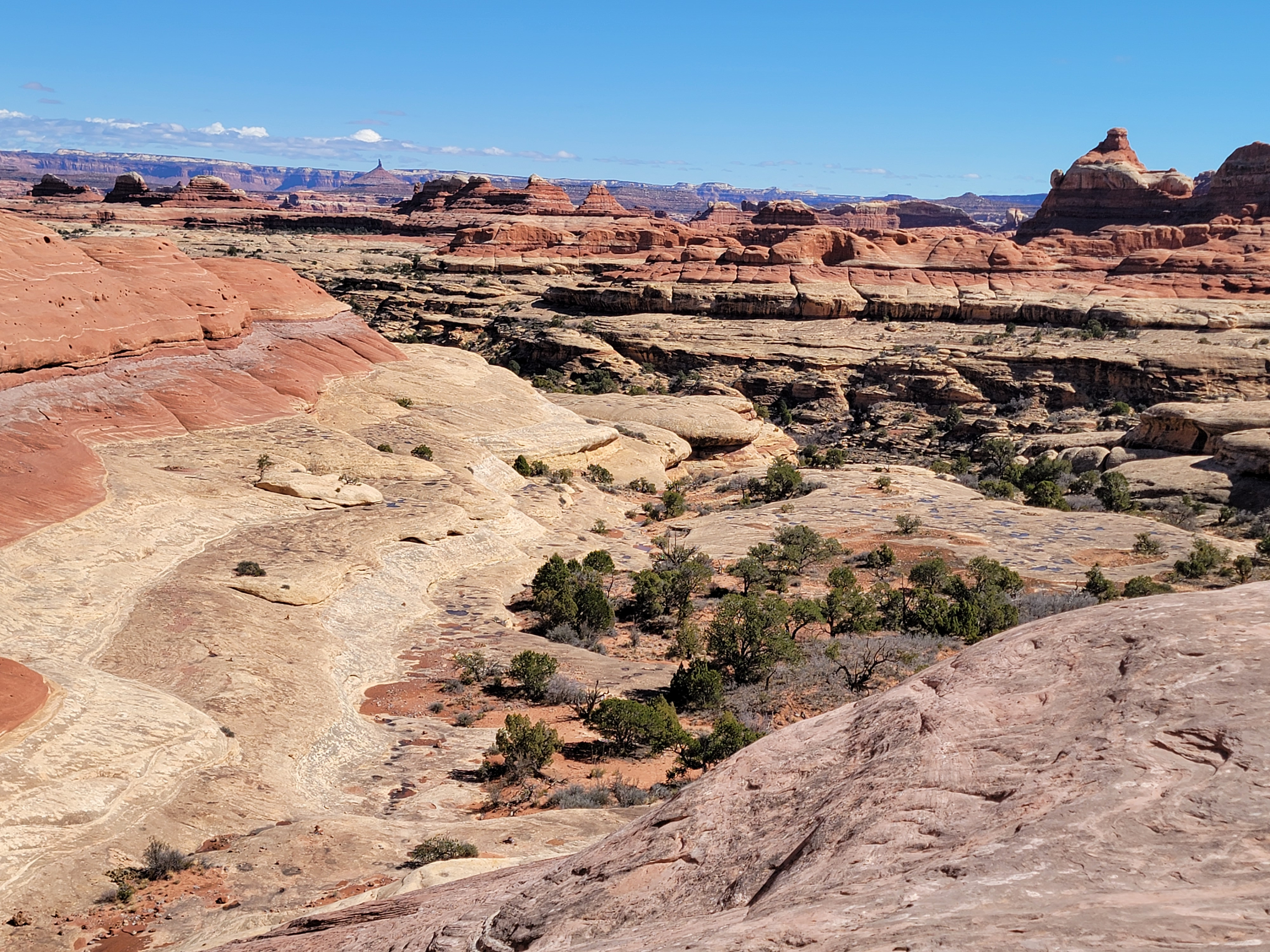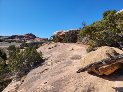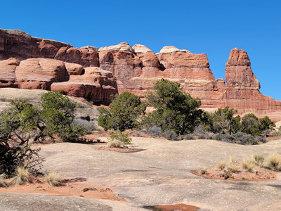 My plan for today was to do the Big Spring Canyon/Squaw Canyon loop. Sandy and I did the hike back in 2015 on our first ever trip to the Needles. I remembered that it was an excellent hike. It also wasn't too long - only seven miles. It seemed like a good starter hike for this trip so I could get an idea of what the present trail conditions were. There was an ominous sign at the trailhead about icy trail conditions in winter. Since hiking on slickrock depends a lot on friction, ice could be a significant problem. There could be some in sheltered or shaded areas even though the area in general seemed completely clear. I thought it was better to start out with a shorter hike that I was at least somewhat familiar with.