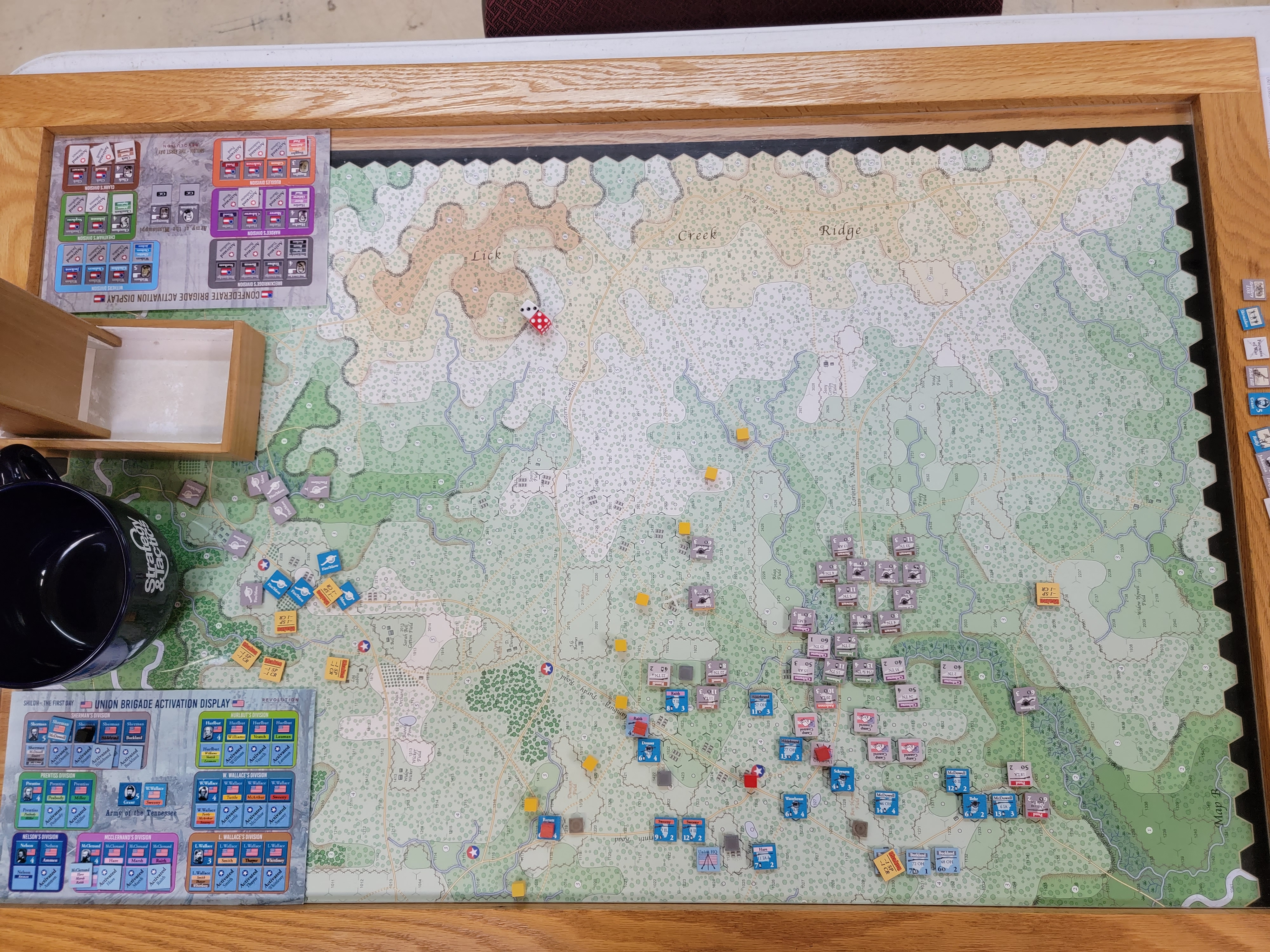 At the next table, Roger Miller and Richard Handeworth, the two guys who are Revolution Games, were playtesting the full two-map campaign game for Shiloh. Of course they had lots of comments and questions for the designer so they were constantly calling "Hey Steve!". They meant Steve Carey of course, not me, but by the end of the day I had a stiff neck from turning around every five minutes.