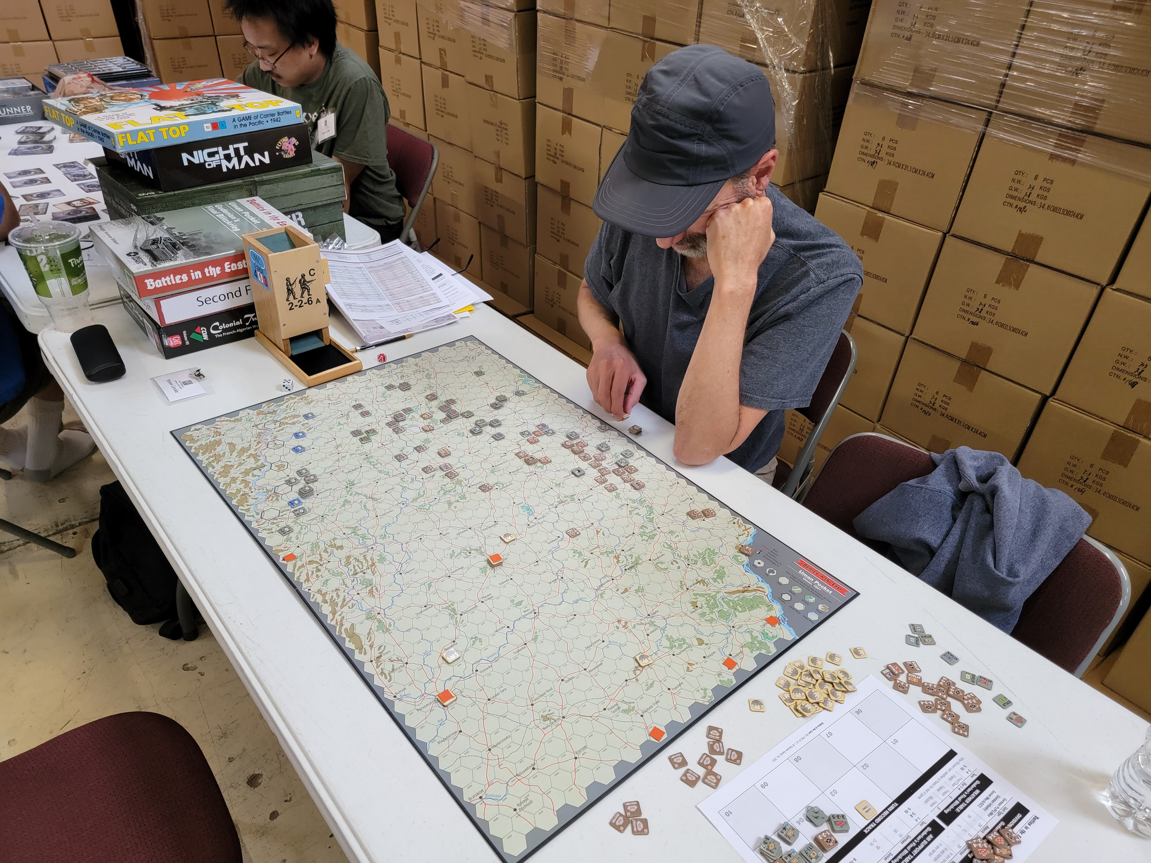 One of the participants was Mark Ruggiero, who is struggling with advanced stage cancer. Besides playing wargames he buys and sells a lot of them online. He and I have bought games from each other many times. Once I even bought an out-of-print game from him that he bought back a year later. This time I was picking up three games from him that a friend in Boise had bought (I was carrying them back to Boise to save shipping cost and effort). I got to talk to Mark and although his chemo was a real challenge, he said that as long as it was physcally possible, he would be coming to wargame conventions. He even talked about plans for GMT weekend in the spring and CSWE next summer. He said that if his time is limited, he wants to spend it doing what he loves.